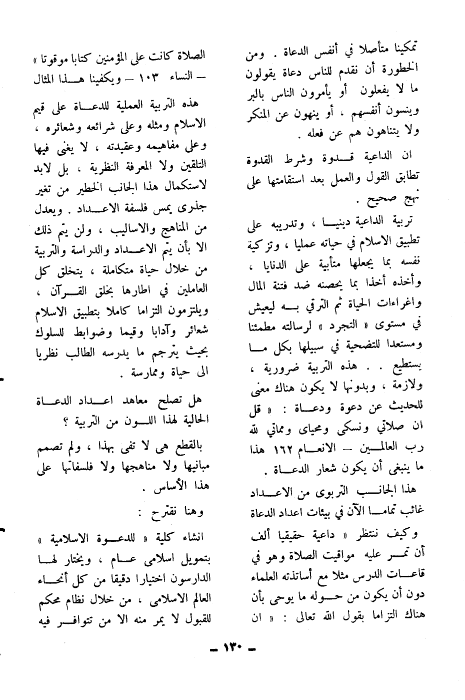 هذا الجانب التربوي من الإعداد غائب تماماً الآن في بيئات إعداد الدعاة وكيف ننتظر داعية حقيقياً ألف أن تمر عليه مواقيت الصلاة وهو في قاعات الدرس مثلاً مع أساتذته العلماء دون أن يكون من حوله ما يوحي أن هناك التزاماً بقول الله تعالى: {إِنَّ الصَّلاةَ كَانَتْ عَلَى الْمُؤْمِنِينَ كِتَاباً مَوْقُوتاً} ـ النساء 103 ـ ويكفينا هذا المثال.