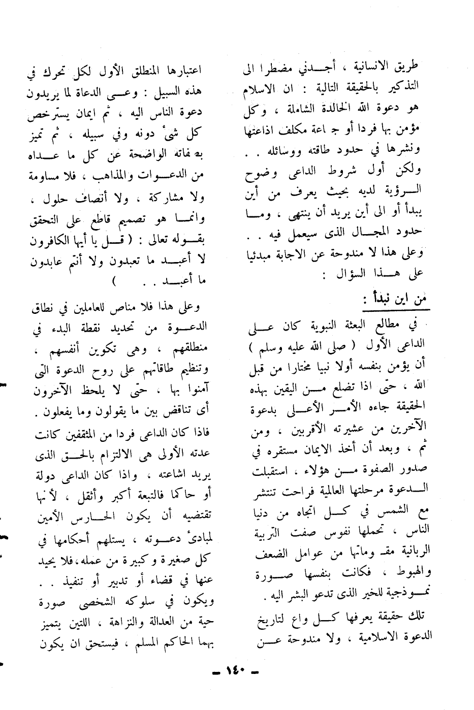طريق الإنسانية، أجدني مضطرا إلى التذكير بالحقيقة التالية: إن الإسلام هو دعوة الله الخالدة الشاملة، وكل مؤمن بها فردا أو جماعة مكلف اذا عتها ونشرها في حدود طاقته ووسائله.. ولكن أول شروط الداعي وضوح الرؤية لديه بحيث يعرف من أين يبدأ أو إلى أين يريد أن ينتهي، وما حدود المجال الذي سيعمل فيه.. وعلى هذا لا مندوحة عن الإجابة مبدئيا على هذا السؤال: