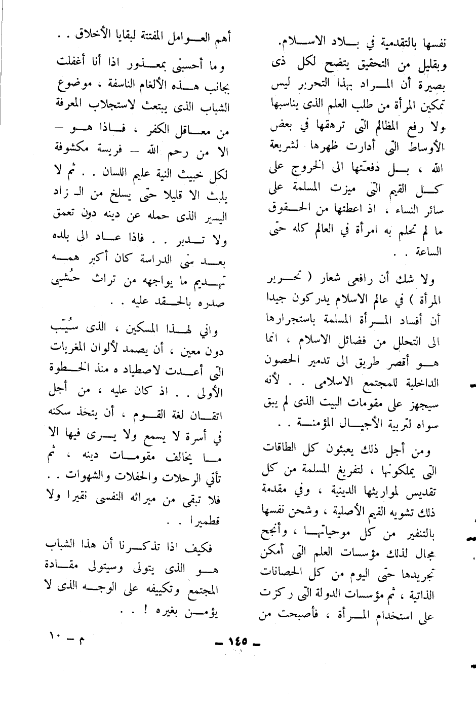 وما أحسبني بمعذور إذا أنا أغفلت بجانب هذه الألغام الناسفة، موضوع الشباب الذي يبتعث لاستجلاب المعرفة من معاقل الكفر، فإذا هو ـ إلا من رحم الله ـ فريسة مكشوفة لكل خبيث النية عليم اللسان.. ثم لا يلبث إلا قليلا حتى يسلخ من الزاد اليسير الذي حمله عن دينه دون تعمق ولا تدبر.. فإذا عاد إلى بلده بعد من الدراسة كان أكبر همه تهديم ما يواجهه من تراث حُشِي صدره بالحقد عليه..