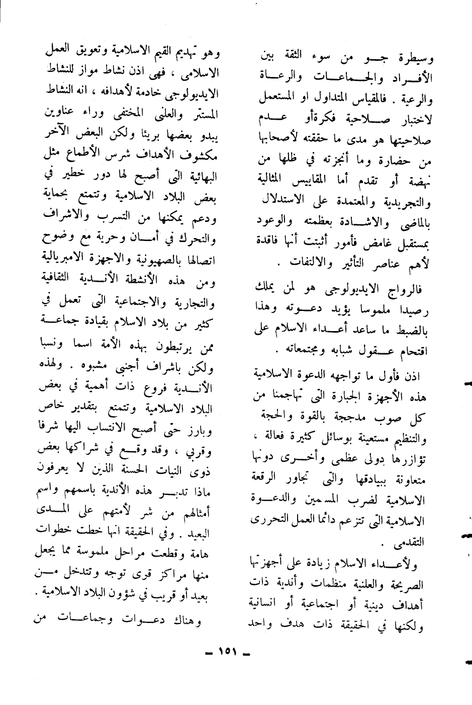 ولأعداء الإسلام زيادة على أجهزتها الصريحة والعلنية منظمات وأندية ذات أهداف دينية أو اجتماعية أو انسانية ولكنها في الحقيقة ذات هدف واحد وهو تهديم القيم الإسلامية وتعويق العمل الإسلامي، فهي إذن نشاط مواز للنشاط الإيديولوجي خادمة لأهدافه، إنه النشاط المستتر والعلني المتخفي وراء عناوين يبدو بعضها بريئا ولكن البعض الآخر مكشوف الأهداف شرس الأطماع مثل البهائية التي أصبح لها دور خطير في بعض البلاد الإسلامية وتتمتع بحماية ودعم يمكنها من التسرب والإشراف والتحرك في أمان وحرية مع وضوح اتصالها بالصهيونية والأجهزة الإمبريالية ومن هذه الأنشطة الأندية الثقافية والتجارية والإجتماعية التي تعمل في كثير من بلاد الإسلام بقيادة جماعة ممن يرتبطون بهذه الأمة إسما ونسبا ولكن باشراف أجنبي مشبوه. ولهذه الأندية فروع ذات أهمية في بعض البلاد الإسلامية وتتمتع بتقدير خاص وبارز حتى أصبح الإنتساب إليها شرفا وقربى، وقد وقع في شراكها بعض ذوي النبات الحسنة الذين لا يعرفون ماذا تدبر هذه الأندية بإسمهم وإسم أمثالهم من شر لأمتهم على المدى البعيد. وفي الحقيقة أنها خطت خطوات هامة وقطعت مراحل ملموسة مما يجعل منها مراكز قوى توجه وتتدخل من بعيد أو قريب في شؤون البلاد الإسلامية.