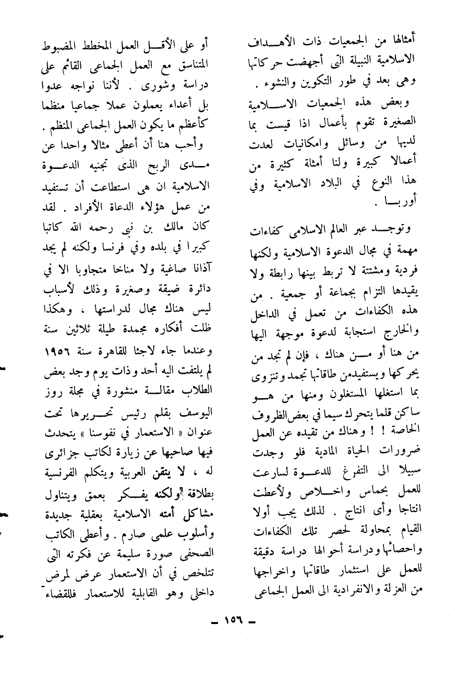وأحب هنا أن أعطي مثالا واحدا عن مدى الربح الذي تجنيه الدعوة الإسلامية إن هي استطاعت أن تستفيد من عمل هؤلاء الدعاة الأفراد. لقد كان مالك بن نبي رحمه الله كاتبا كبيرا في بلده وفي فرنسا ولكنه لم يجد آذانا صاغية ولا مناخا متجاوبا إلا في دائرة ضيقة وصغيرة وذلك لأسباب ليس هناك مجال لدراستها، وهكذا ظلت أفكاره مجمدة طيلة ثلاثين سنة وعندما جاء لاجئا للقاهرة سنة 1956لم يلتفت إليه أحد وذات يوم وجد بعض الطلاب مقالة منشورة في مجلة روز اليوسف بقلم رئيس تحريرها تحت عنوان ((الإستعمار في نفوسنا)) يتحدث فيها صاحبها عن زيارة لكاتب جزائري له، لا يتقن العربية ويتكلم الفرنسية بطلاقة ولكنه يفكر بعمق ويتناول مشاكل أمته الإسلامية بعقلية جديدة وأسلوب علمي صارم. وأعطى الكاتب الصحفي صورة سليمة عن فكرته التي تتلخص في أن الإستعمار عرض لمرض داخلي وهو القابلية للإستعمار فللقضاء