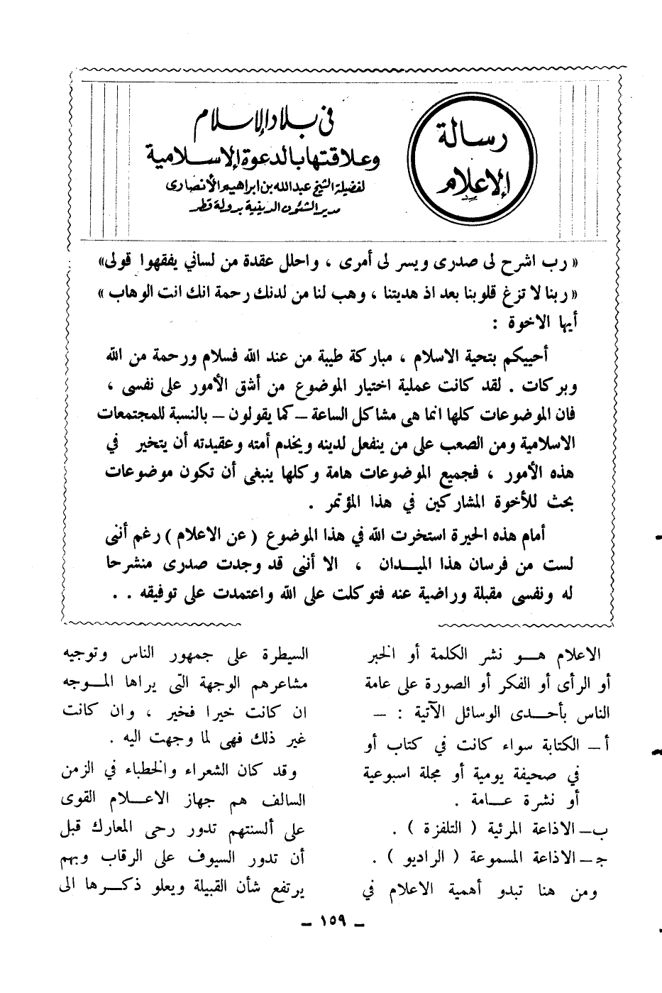 رسالة الإعلام في بلاد الإسلام وعلاقتها بالدعوة الإسلامية للشيخ عبد الله بن إبراهيم الأنصاري