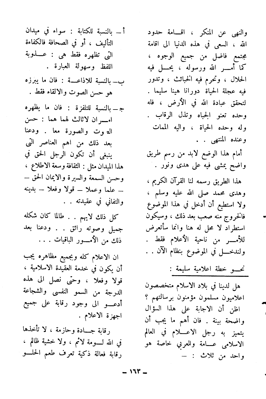 إن الإعلام كله وبجميع مظاهره يجب أن يكون في خدمة العقيدة الإسلامية، قولا وفعلا، وحتى نصل إلى هذه الدرجة من السمو النفسي والشجاعة أدعو إلى وجوب رقابة على جميع أجهزة الإعلام.