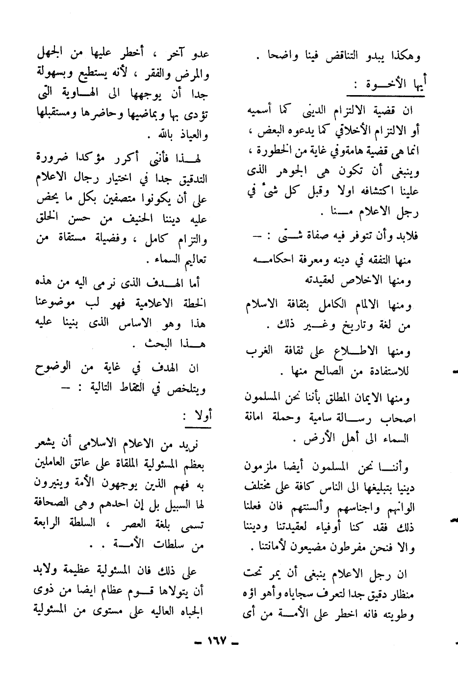 إن قضية الالتزام الديني كما أسميه أو الالتزام الأخلاقي كما يدعوه البعض، إنما هي قضية هامة وفي غاية من الخطورة، وينبغي أن تكون هي الجوهر الذي علينا اكتشافه أولا وقبل كل شيء في رجل الإعلام منا.