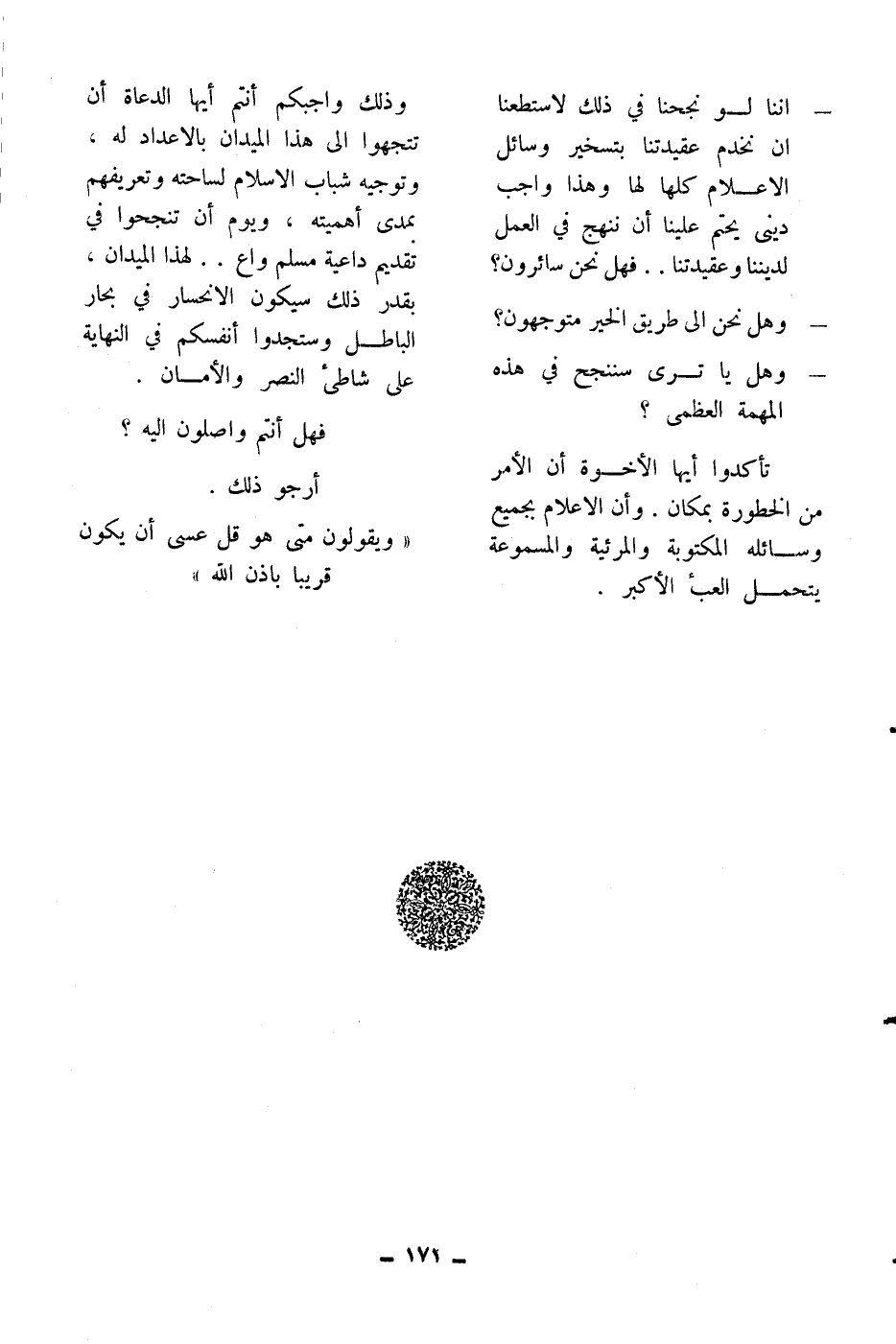 ـ إننا لو نجحنا في ذلك لاستطعنا أن نخدم عقيدتنا بتسخير وسائل الإعلام كلها لها وهذا واجب ديني يحتم علينا أن ننهج في العمل لديننا وعقيدتنا.. فهل نحن سائرون؟