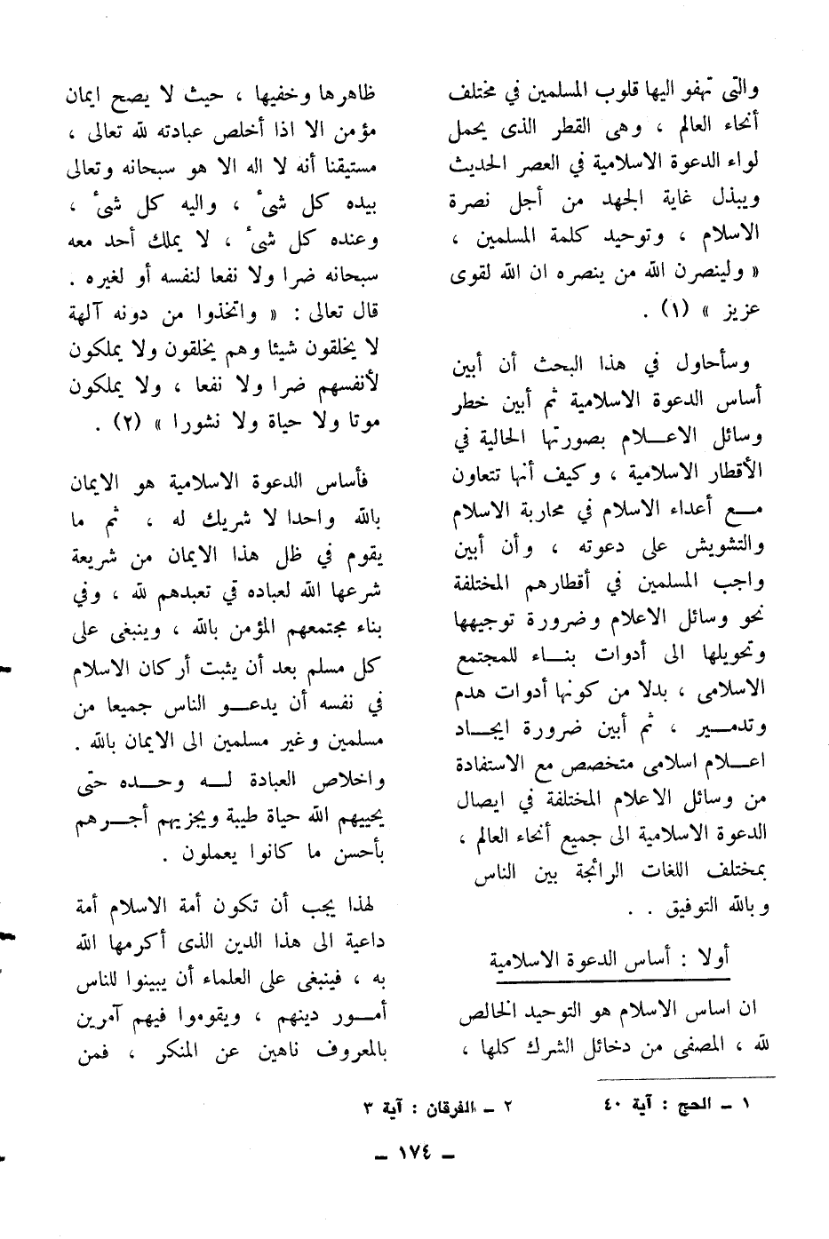 فأساس الدعوة الإسلامية هو الإيمان بالله واحدا لا شريك له، ثم ما يقوم في ظل هذا الإيمان من شريعة شرعها الله لعباده في تعبدهم لله، وفي بناء مجتمعهم المؤمن بالله، وينبغي على كل مسلم بعد أن يثبت أركان الإسلام في نفسه أن يدعو الناس جميعا من مسلمين وغير مسلمين إلى الإيمان بالله. واخلاص العبادة له وحده حتى يحييهم الله حياة طيبة ويجزيهم أجرهم بأحسن ما كانوا يعملون.