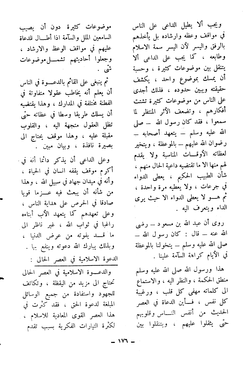هذا ورسول الله صلى الله عليه وسلم منطق الحكمة، والنظر إليه، والاستماع إلى كلماته مهفى كل قلب، ورغيبة كل نفس، فأين الدعاة في العصر الحديث من أنفس الناس وقلوبهم حتى يثقلوا عليهم، ويتنقلوا بين موضوعات كثيرة دون أن يصيب السامعين الملل والسآمة إذا أطال الدعاة عليهم في مواقف الوعظ والارشاد، وجعلوا أحاديثهم تشمل موضوعات شتى.