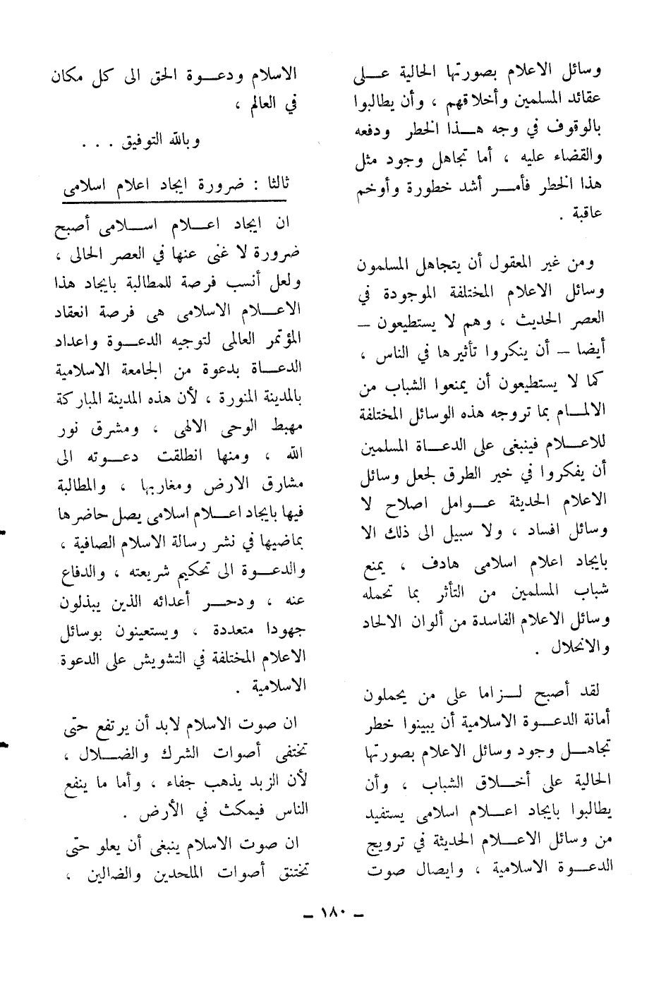 إن إيجاد إعلام إسلامي أصبح ضرورة لا غنى عنها في العصر الحالي، ولعل أنسب فرصة للمطالبة بإيجاد هذا الإعلام الإسلامي هي فرصة انعقاد المؤتمر العالمي لتوجيه الدعوة وإعداد الدعاة بدعوة من الجامعة الإسلامية بالمدينة المنورة، لأن هذه المدينة المباركة مهبط الوحي الإلهي، ومشرق نور الله، ومنها انطلقت دعوته إلى مشارق الأرض ومغاربها، والمطالبة فيها بإيجاد إعلام إسلامي يصل حاضرها بماضيها في نشر رسالة الإسلام الصافية، والدعوة إلى تحكيم شريعته، والدفاع عنه، ودحر أعدائه الذين يبذلون جهوداً متعددة، ويستعينون بوسائل الإعلام المختلفة في التشويش على الدعوة الإسلامية.