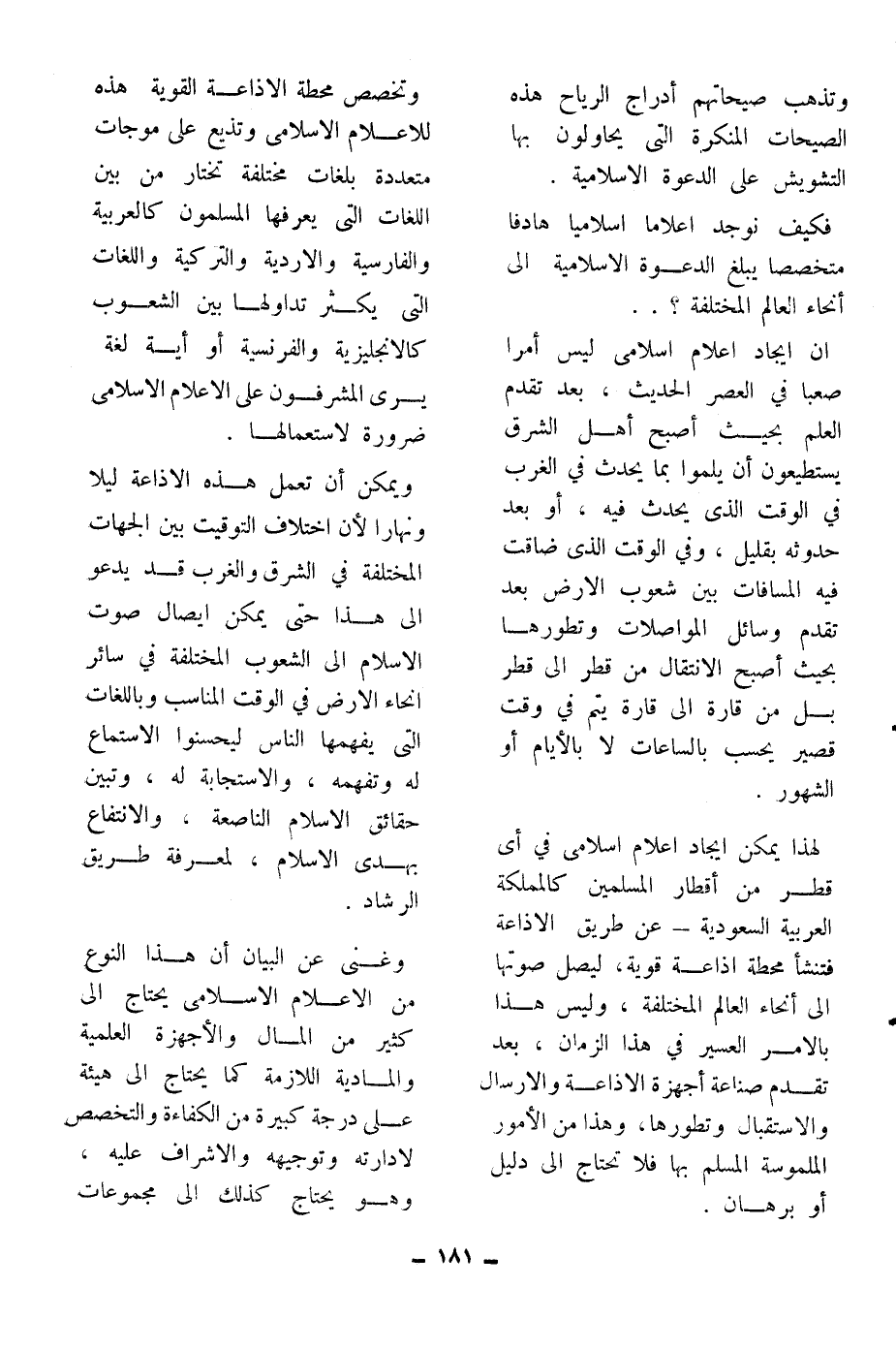 وتخصص محطة الإذاعة القوية هذه للإعلام الإسلامي وتذيع على موجات متعددة بلغات مختلفة تختار من بين اللغات التي يعرفها المسلمون كالعربية والفارسية والاردية والتركية واللغات التي يكثر تداولها بين الشعوب كالإنجليزية والفرنسيةأو أية لغة يرى المشرفون على الإعلام الإسلامي ضرورة لاستعمالها.