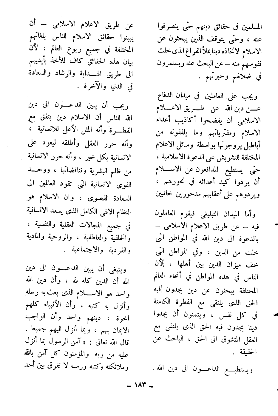 وأما الميدان التبليغي فيقوم العاملون فيه ـ عن طريق الإعلام الإسلامي ـ بالدعوة إلى دين الله في المواطن التي خلت من الدين، وفي المواطن التي خف ميزان الدين بين أهلها، لأن الناس في هذه المواطن في أنحاء العالم المختلفة يبحثون عن دين يجدون فيه الحق الذي يتقي مع الفطرة الكامنة في كل نفس، ويتمنون أن يجدوا دينا يجدون فيه الحق الذي يلتقي مع العقل المتشوق إلى الحق، الباحث عن الحقيقة.