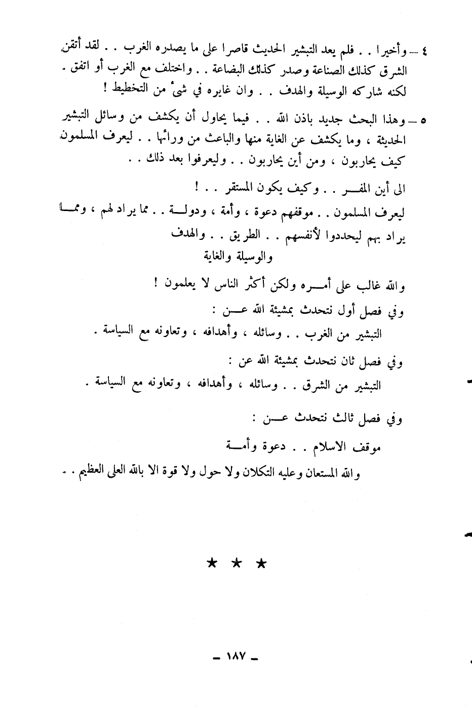 5ـ وهذا البحث جديد بإذن الله.. فيما يحاول أن يكشف من وسائل التبشير الحديثة، وما يكشف عن الغاية منها والباعث من ورائها.. ليعرف المسلمون كيف يحاربون، ومن أين يحاربون.. وليعرفوا بعد ذلك..