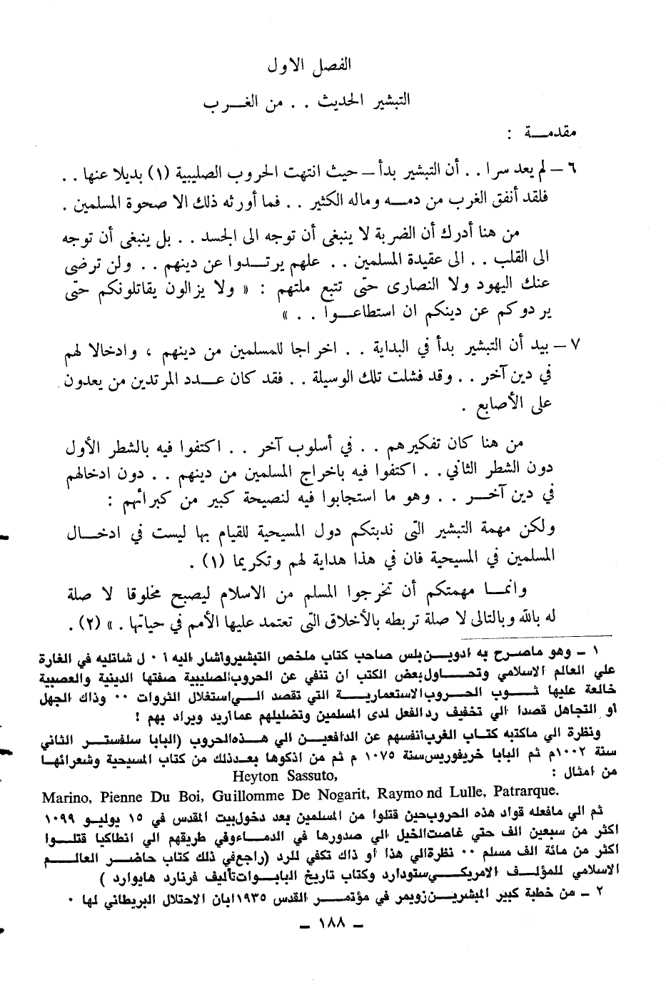 1 - وهو ماصرح به أدوين بلس صاحب كتاب ملخص اتبشير وأشار إليه أ. ل شاتليه في الغارة على العالم الإسلامي وتحاول بعض الكتب أن تنفي عن الحروب الصليبية صفتها الدينية والعصبية خالعة عليها ثوب الحروب الاستعمارية التي تقصد إلى استغلال الثروات.. وذلك الجهل أو التجاهل قصدا إلى تخفيف رد الفعل لدى المسلمين وتظليلهم عما أريد ويراد بهم!