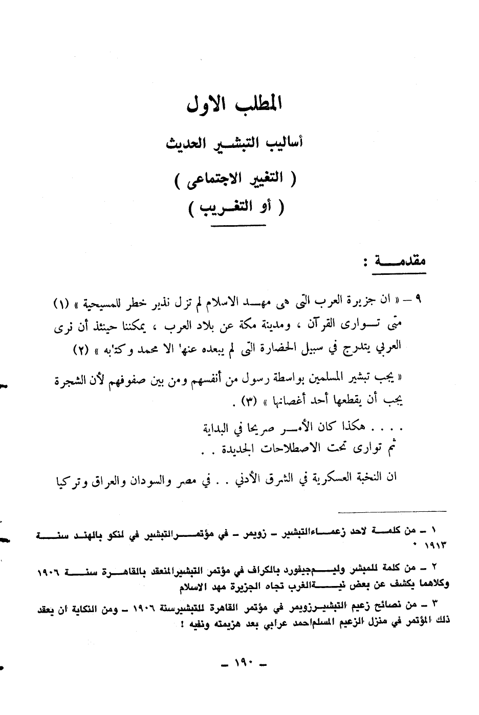 2 - من كلمة للمبشر وليم جيفورد بالكراف في مؤتمر التبشير المنعقد بالقاهرة سنة 1906 وكلاهما يكشف عن بعض نية الغرب تجاه الجزيرة مهد الإسلام.