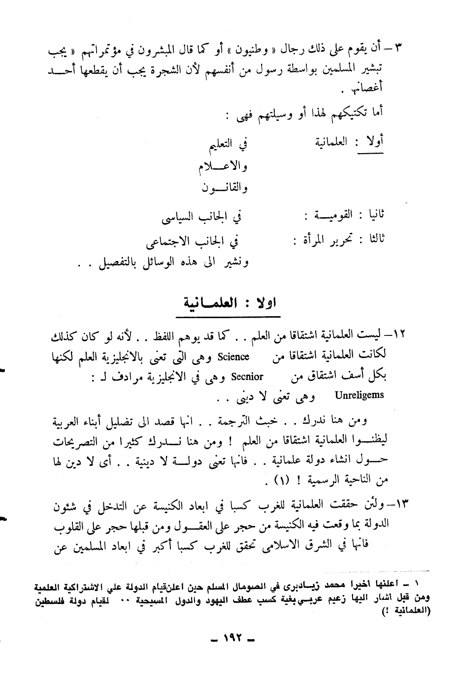 ومن هنا ندرك.. خبث الترجمة.. إنها قصد إلى تظليل أبناء العربية ليظنوا العلمانية اشتقاقا من العلم! ومن هنا ندرك كثيرا من التصريحات حول انشاء دولة علمانية.. فإنها تعني دولة لا دينية.. أي لا دين لها من الناحية الرسمية! 1.