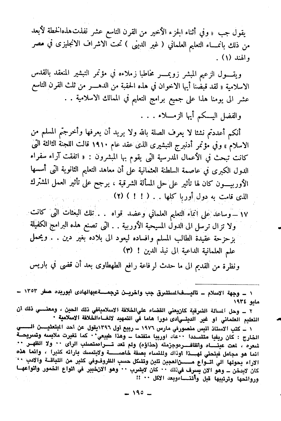 17ـ وساعد على انماء التعليم العلماني وعضد قواه.. تلك البعثات التي كانت ولا تزال ترسل إلى الدول المسيحية الأوربية.. التي تصنع هذه البرامج الكفيلة بزحزحة عقيدة الطالب المسلم وافساده ليعود إلى بلاده بغير دين.. ويحمل علم العلمانية الداعية إلى نبذ الدين! 3.