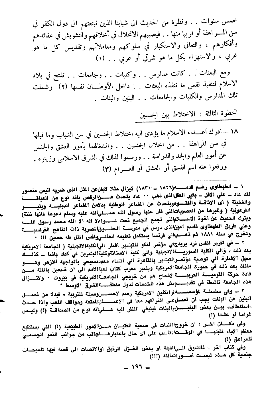 1 - الطهطاوي رغم قدمه (1826 ـ 1831) لا يزال مثلا لا يقل عن المثل الذي ضربه أنيس منصور لقد عاد ـ على الأقل ـ بغير العقل الذي ذهب.. عاد يتحدث عن الرقص بأنه نوع من العياقة والشلبنة (أي الاناقة والفتوه) ويتحدث عن المشاعر الوطنية بدلا من المشاعر الدينية ويثير الفرعونية (وغيرها من العصبيات التي قال عنها رسول الله صلى الله عليه وسلم: "دعوها فإنها نتنة ") ويترك الحديث عن أخوة الإسلام التي تجمع الجميع تحت لواء لا إله إلا الله محمد رسول الله وعلى طريق الطهطاوي قاسم أمين الذي درس في مدرسة الحقوق المصرية ذات المناهج الفرنسية وتخرج في سنة 1881 ثم ذهب إلى فرنسا يستكمل تعليمه العالي ونفس المثل طه حسين!!!.