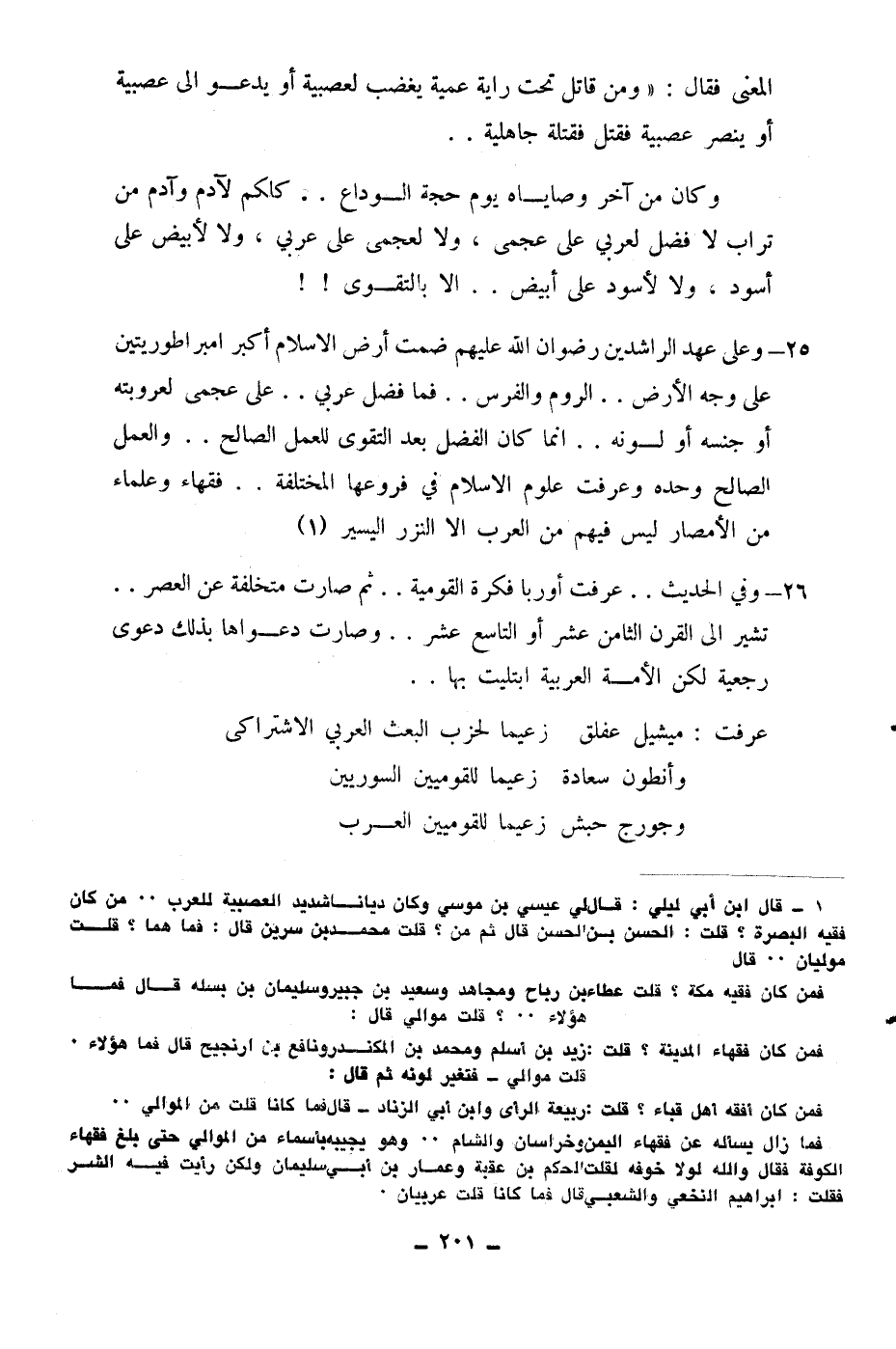 26ـ وفي الحديث.. عرفت أوربا فكرة القومية.. ثم صارت متخلفة عن العصر.. تشير إلى القرن الثامن عشر أو التاسع عشر.. وصارت دعواها بذلك دعوى رجعية لكن الأمة العربية ابتليت بها..
