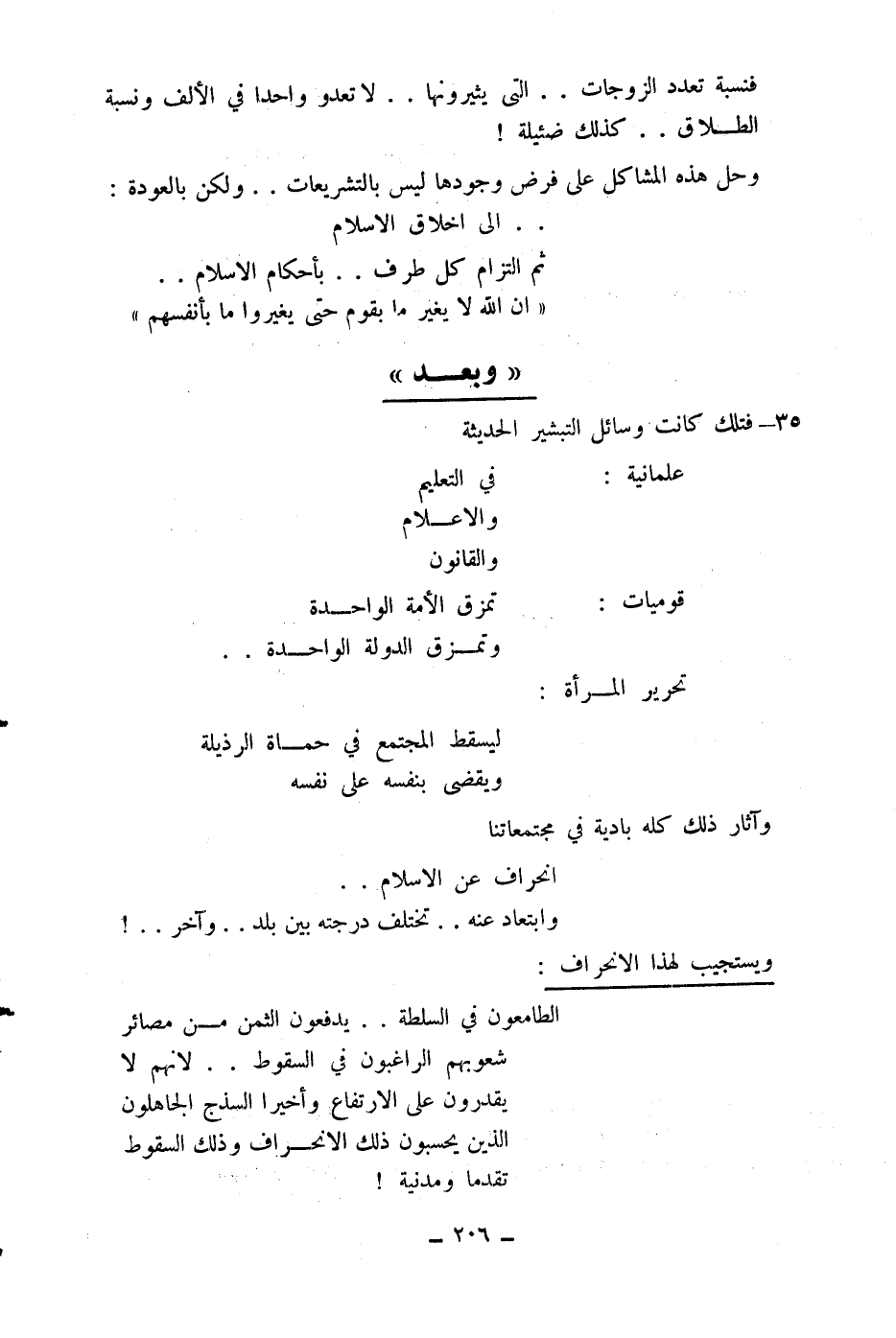 فنسبة تعدد الزوجات.. التي يثيرونها.. لا تعدو واحداً في الألف ونسبة الطلاق كذلك ضئيلة!