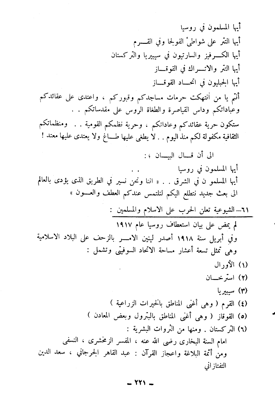 أنتم يا من انتهكت حرمات مساجدكم وقبوركم، واعتدى على عقائدكم وعبادتكم وداس القياصرة والطغاة الروس على مقدساتكم..