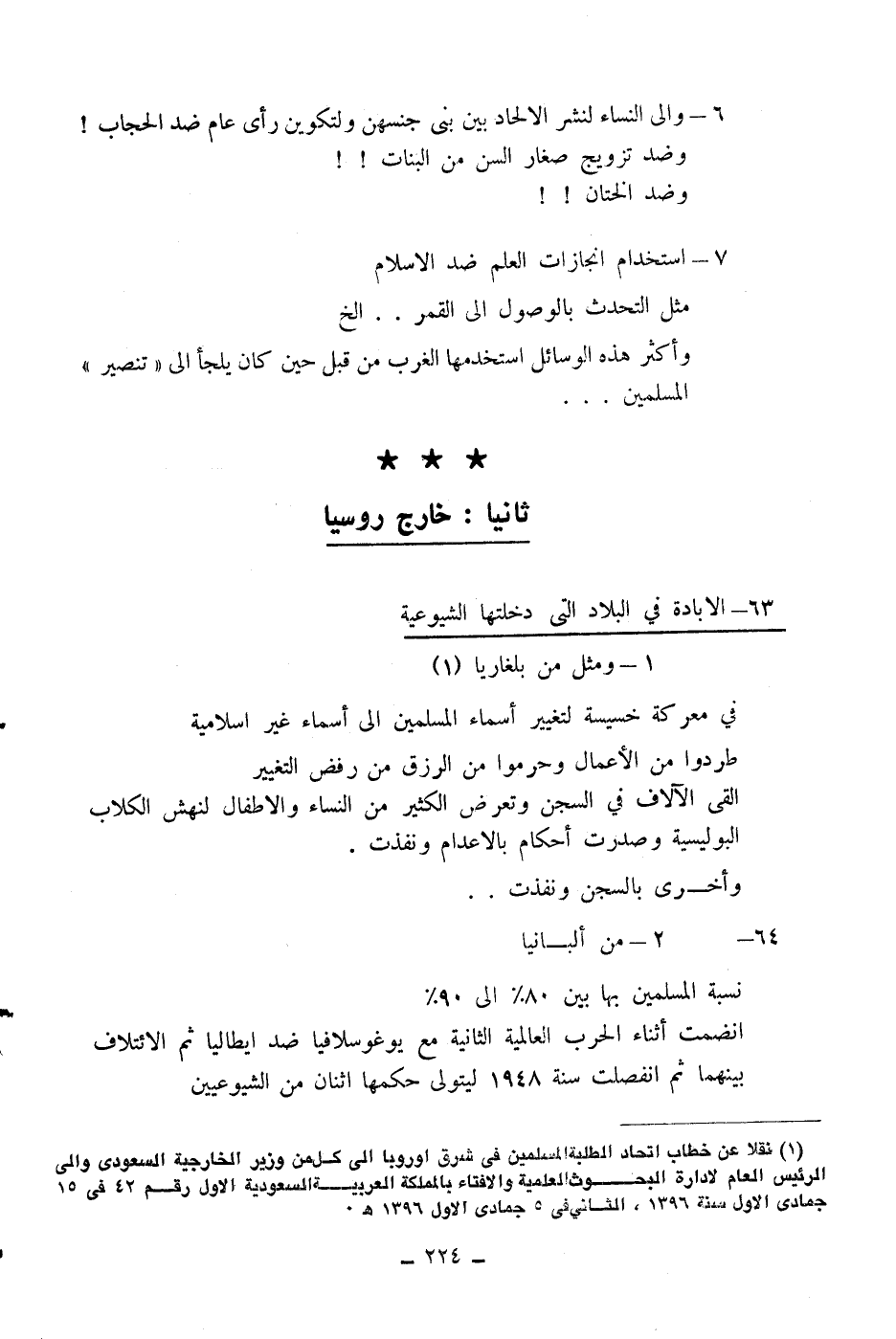 1 - نقلا عن خطاب اتحاد الطلبة المسلمين في شرق أوربا إلى كل من وزير الخارجية السعودي وإلى الرئيس العام لإدارة البحوث العلمية والافتاء بالمملكة العربية السعودية الأول رقم 42 في 15 جمادى الأول سنة 1396، الثاني في 5 جمادى الأول 1396 هـ.