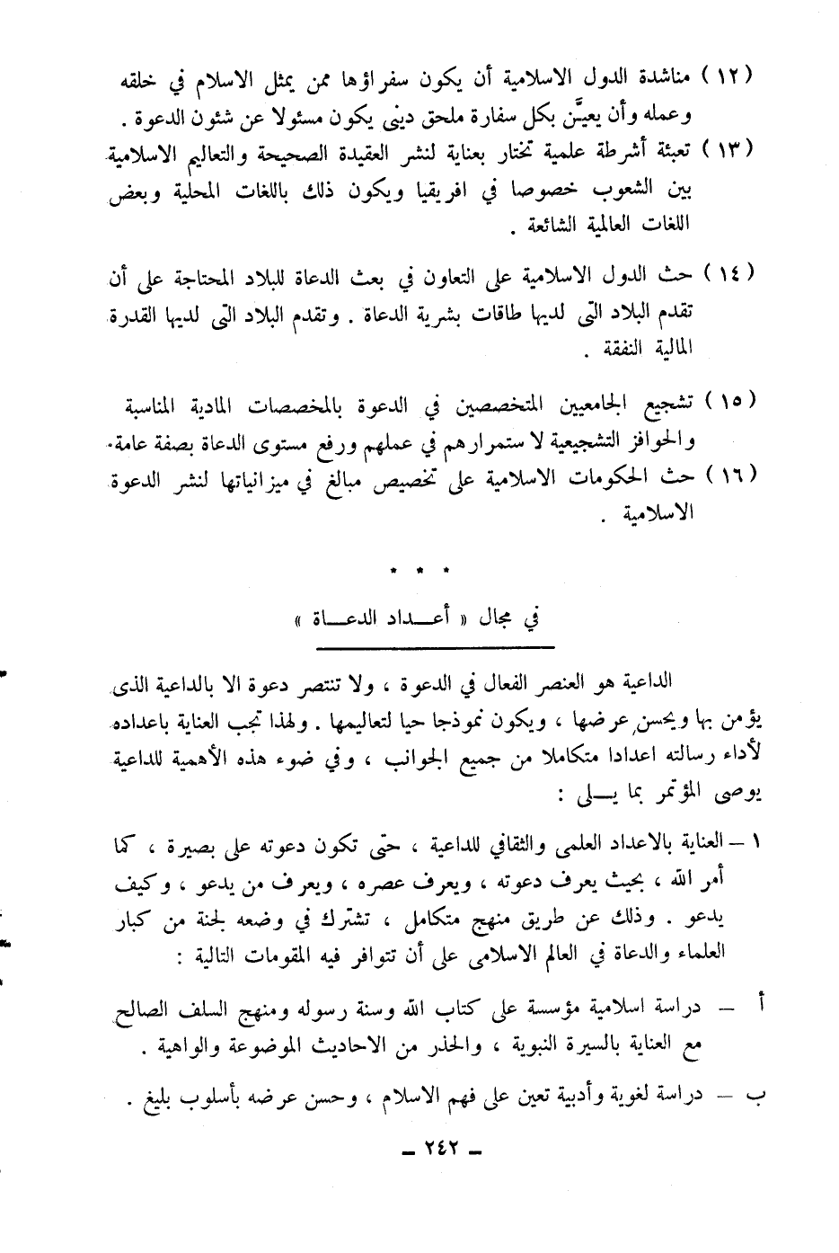 (1) مناشدة الدول الإسلامية أن يكون سفراؤها ممن يمثل الإسلام في خلقه وعمله وأن يعين بكل سفارة ملحق ديني يكون مسؤولا عن شؤون الدعوة.