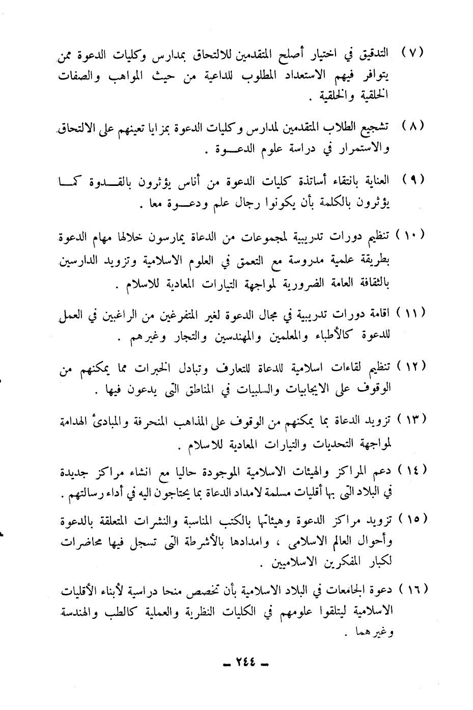 (10) دعوة الجامعات في البلاد الإسلامية بأن تخصص منحاً دراسية لأبناء الأقليات الإسلامية ليتلقوا علومهم في الكليات النظرية والعملية كالطب والهندسة وغيرهما.
