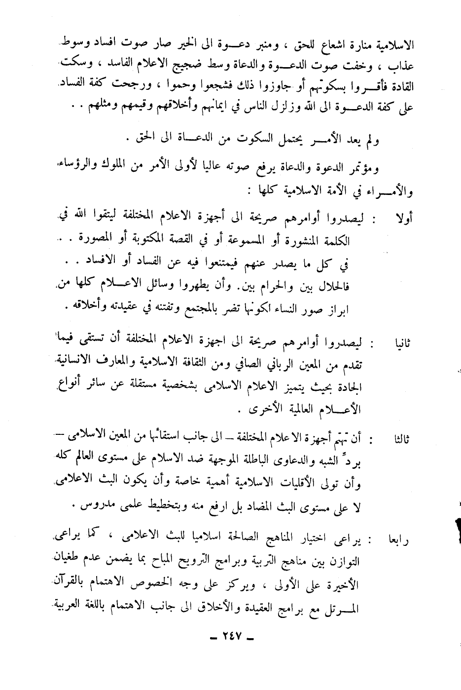 أولا: ليصدروا أوامرهم صريحة إلى أجهزة الإعلام المختلفة ليتقوا الله في الكلمة المنشورة أو المسموعة أو في القصة المكتوبة أو المصورة.. في كل ما يصدر عنهم فيمتنعوا فيه عن الفساد أو الإفساد.. فالحلال بين والحرام بين. وأن يطهروا وسائل الإعلام كلها من إبراز صور النساء لكونها تضر بالمجتمع وتفتنه في عقيدته وأخلاقه.
