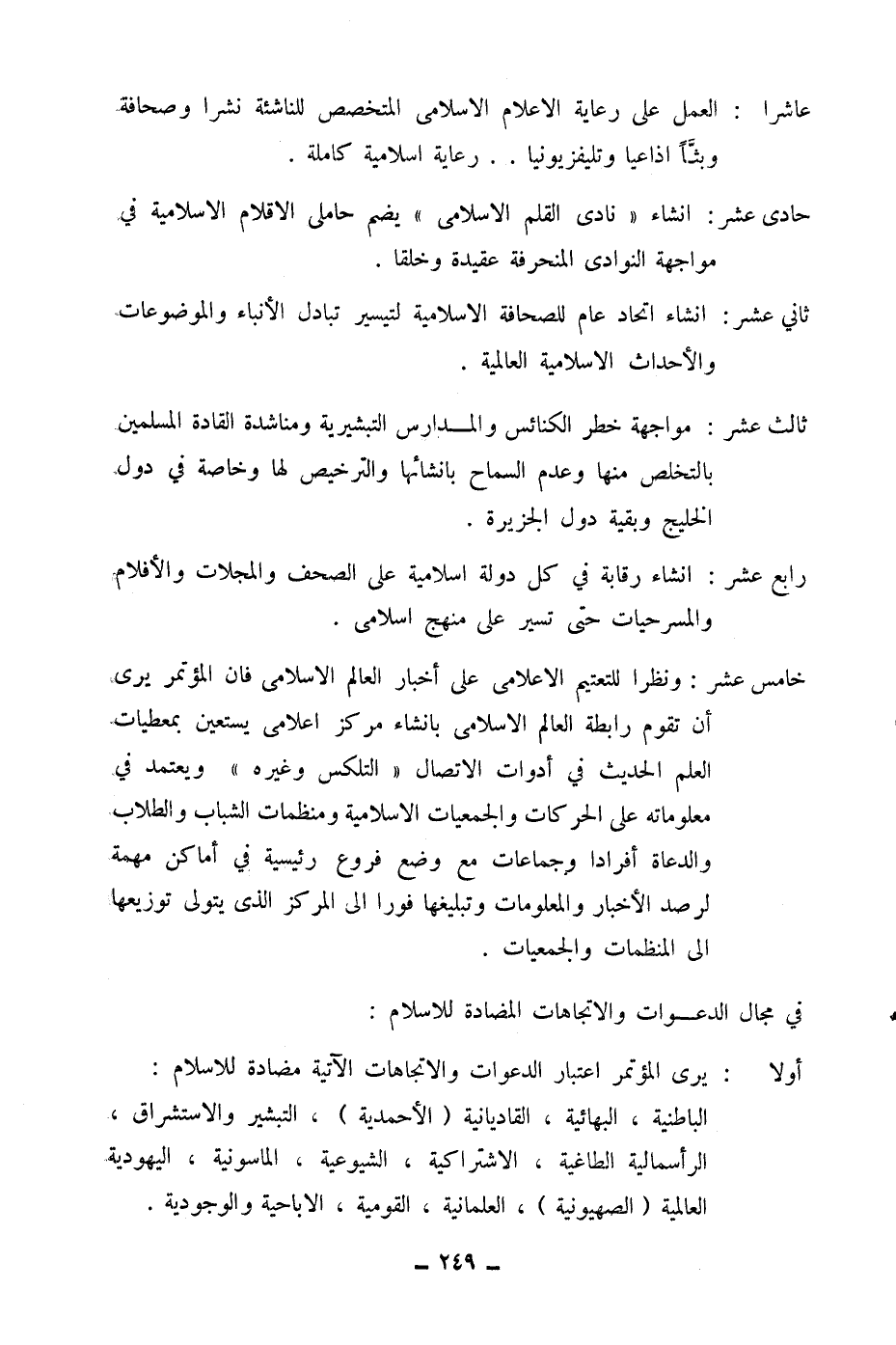 خامس عشر: ونظراً للتعتيم الإعلامي على أخبار العالم الإسلامي فإن المؤتمر يرى أن تقوم رابطة العالم الإسلامي بإنشاء مركز إعلامي يستعين بمعطيات العلم الحديث في أدوات الاتصال ((التلكس وغيره)) ويعتمد في معلوماته على الحركات والجمعيات الإسلامية ومنظمات الشباب والطلاب والدعاة أفراداً وجماعات مع وضع فروع رئيسية في أماكن مهمة لرصد الأخبار والمعلومات وتبليغها فوراً إلى المركز الذي يتولى توزيعها إلى المنظمات والجمعيات.