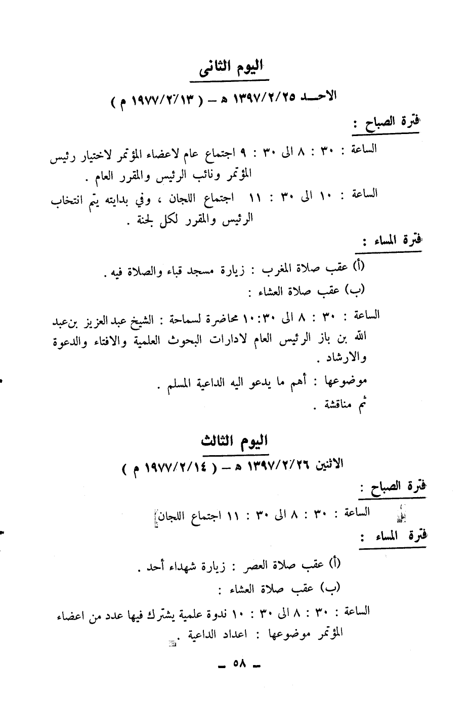 الساعة: 8:30 إلأى 10:30 محاضرة لسماحة الشيخ عبد العزيز بن عبد الله بن باز الرئيس العام لإدارات البحوث العلمية والإفتاء والدعوة والإرشاد.