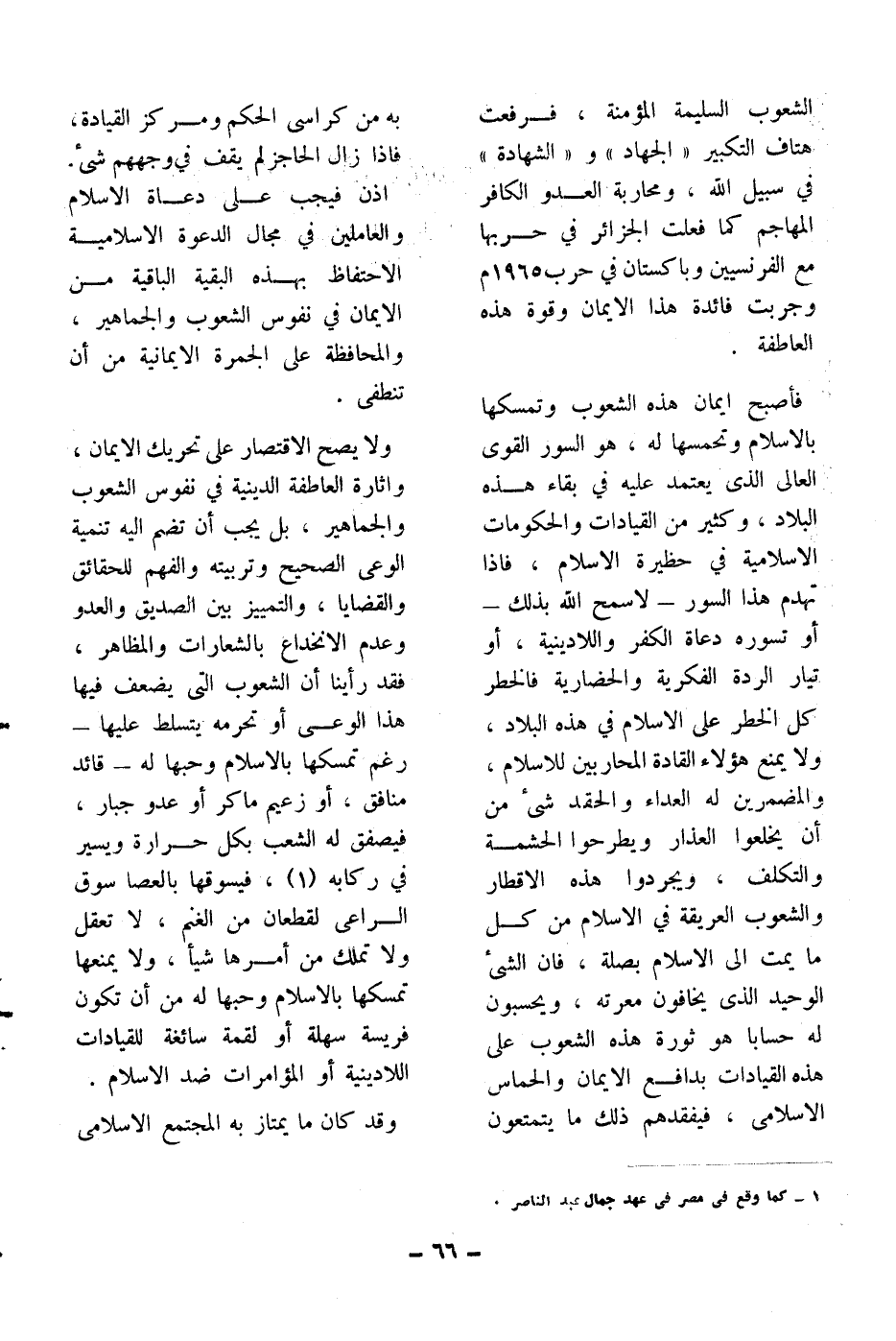 الشعوب السليمة المؤمنة، فرفعت هتفات التكبير)) الجهاد ((و)) الشهادة ((في سبيل الله، ومحاربة العدو الكافر المهاجم كما فعلت الجزائر في حربها مع الفرنسيين وباكستان في حرب 1965م وجربت فائدة هذا الإيمان وقوة هذه العاطفة.