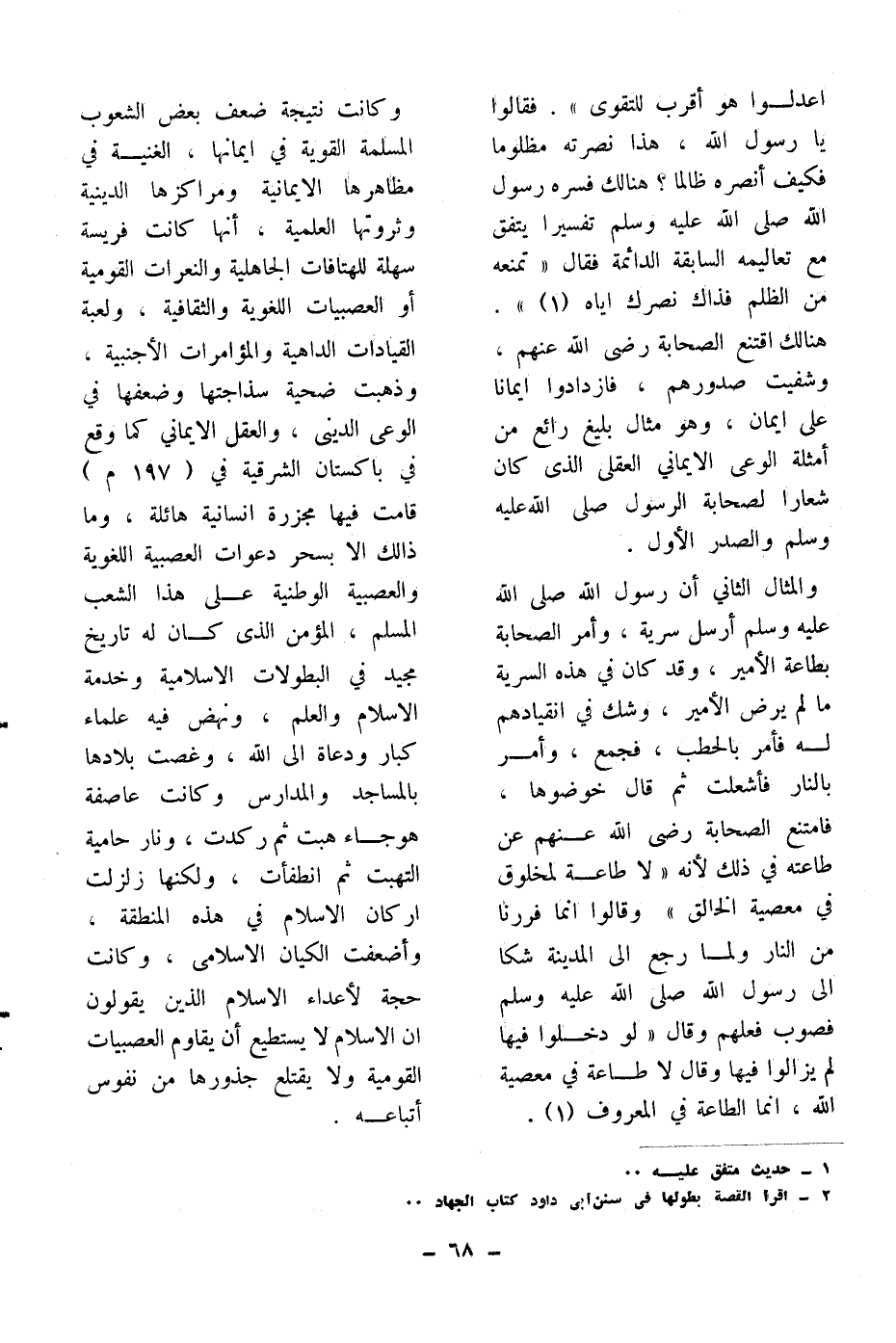 وكانت نتيجة ضعف بعض الشعوب المسلمة القوية في إيمانها، الغنية في مظاهرها الإيمانية ومراكزها الدينية وثروتها العلمية، أنها كانت فريسة سهلة للهتافات الجاهلية والنعرات القومية أو العصبيات اللغوية والثقافية، ولعبة القيادات الداهية والمؤامرات الأجنبية، وذهبت ضحية سذاجتها وضعفها في الوعي الديني، والعقل الإيماني كما وقع في باكستان الشرقية في (197م) قامت فيها مجزرة إنسانية هائلة، وما ذلك إلا بسحر دعوات العصبية اللغوية والعصبية الوطنية على هذا الشعب المسلم، المؤمن الذي كان له تاريخ مجيد في البطولات الإسلامية وخدمة الإسلام والعلم، ونهض فيه علماء كبار ودعاة إلى الله، وغصت بلادها بالمساجد والمدارس وكانت عاصفة هوجاء هبت ثم ركدت، ونار حامية التهبت ثم انطفأت، ولكنها زلزلت أركان الإسلام في هذه المنطقة، وأضعفت الكيان الإسلامي، وكانت حجة لأعداء الإسلام الذين يقولون إن الإسلام لا يستطيع أن يقاوم العصبيات القومية ولا يقتلع جذورها من نفوس أتباعه.