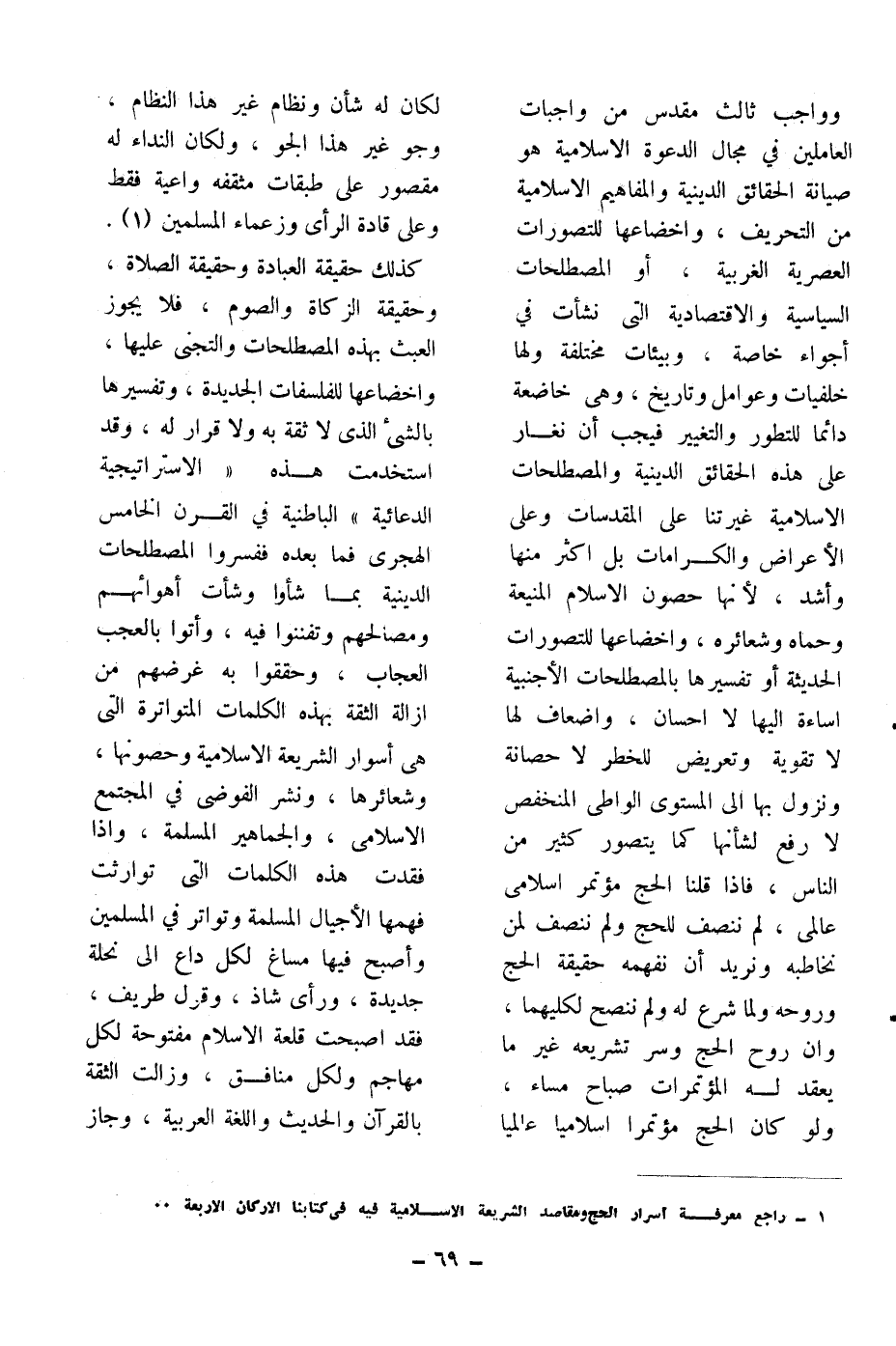 وواجب ثالث مقدس من واجبات العاملين في مجال الدعوة الإسلامية هو صيانة الحقائق الدينية والمفاهيم الإسلامية من التحريف، وإخضاعها للتصورات العصرية الغربية، أو المصطلحات السياسية والاقتصادية التي نشأت في أجواء خاصة، وبيئات مختلفة ولها خلفيات وعوامل وتاريخ، وهي خاضعة دائما للتطور والتغيير، فيجب أن نغار على هذه الحقائق الدينية والمصطلحات الإسلامية غيرتنا على المقدسات وعلى الأعراض والكرامات بل أكثر منها وأشد، لأنها حصون الإسلام المنيعة وحماه وشعائره، وإخضاعها للتصورات الحديثة وتفسيرها بالمصطلحات الأجنبية إساءة إليها لا إحسان، وإضعاف لها لا تقوية وتعريض للخطر لا حصانة ونزول بها إلى المستوى الواطي المنخفض لا رفع لشأنها كما يتصور كثير من الناس، فإذا قلنا الحج مؤتمر إسلامي عالمي، لم ننصف الحج ولم ننصف لمن نخاطبه ونريد أن نفهمه حقيقة الحج وروحه ولما شرع له ولم ننصح لكليهما، وإن روح الحج وسر تشريعه غير ما يعقد له المؤتمرات صباح مساء، ولو كان الحج مؤتمراً إسلامياً عالميا لكان له شأن ونظام غير هذا النظام، وجو غير هذا الجو، ولكان النداء له مقصور على طبقات مثقفة واعية فقط وعلى قادة الرأي وزعماء المسلمين1.