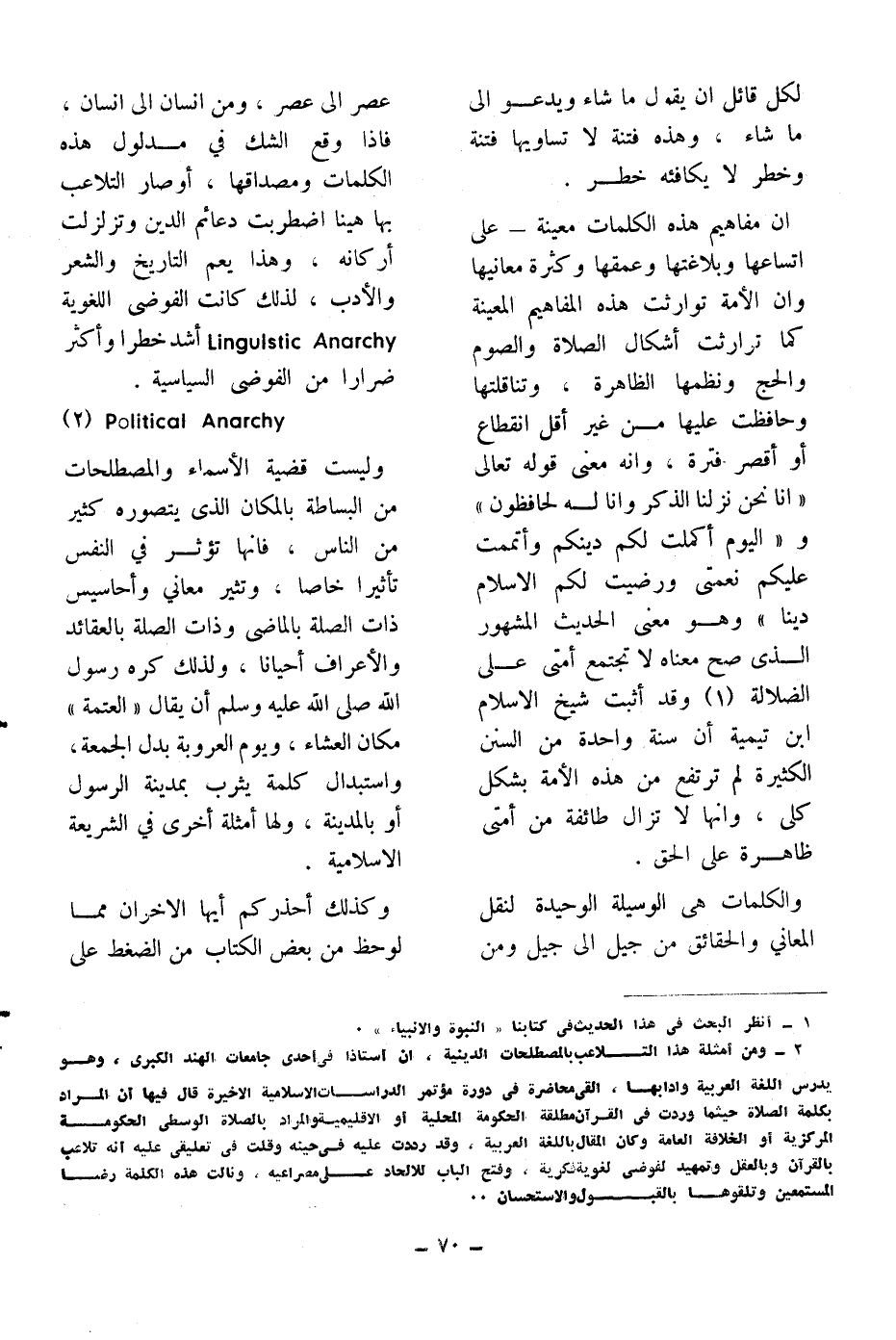 2 ـ ومن أمثلة هذا التلاعب بالمصطلحات الدينية، أن أستاذا في إحدى جامعات الهند الكبرى، وهو يدرس اللغة العربية وآدابها، ألقى محاضرة في دورة مؤتمر الدراسات الإسلامية الأخيرة قال فيها أن المراد بكلمة الصلاة حيث وردت في القرآن مطلقة الحكومة المحلية أو الإقليمية والمراد بالصلاة الوسطى الحكومة المركزية أو الخلافة العامة وكان المقال باللغة العربية، وقد رددت عليه في حينه وقلت في تعليقي عليه أنه تلاعب بالقرآن وبالعقل وتمهيد لفوضى لغوية فكرية، وفتح الباب للإلحاد على مصراعيه، ونالت هذه الكلمة رضا المستمعين وتلقوها بالقبول والاستحسان..