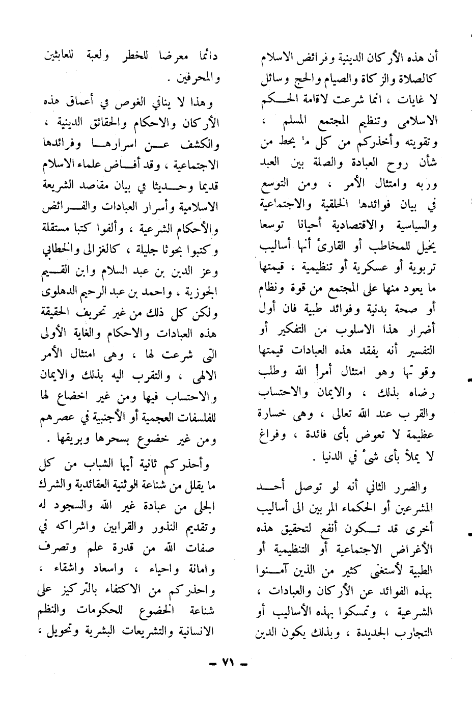 أن هذه الأركان الدينية وفرائض الإسلام كالصلاة والزكاة والصيام والحج وسائل لا غايات، إنما شرعت لإقامة الحكم الإسلامي وتنظيم المجتمع المسلم، وتقويته وأحذركم من كل ما يحط من شأن روح العبادة والصلة بين العبد وربه وامتثال الأمر، ومن التوسع في بيان فوائدها الخلقية والاجتماعية والسياسية والاقتصادية أحياناً توسعاً يخيل للمخاطب أو القارئ أنها أساليب تربوية أو عسكرية أو تنظيمية، قيمتها ما يعود منها على المجتمع من قوة ونظام أو صحة بدنية وفوائد طبية فإن أول أضرار هذا الأسلوب من التفكير أو التفسير أنه يفقد هذه العبادات قيمتها وقوتها وهو امتثال أمر الله وطلب رضاه بذلك، والإيمان والاحتساب والقرب عند الله تعالى، وهي خسارة عظيمة لا تعوض بأي فائدة، وفراغ لا يملأ بأي شيء في الدنيا.