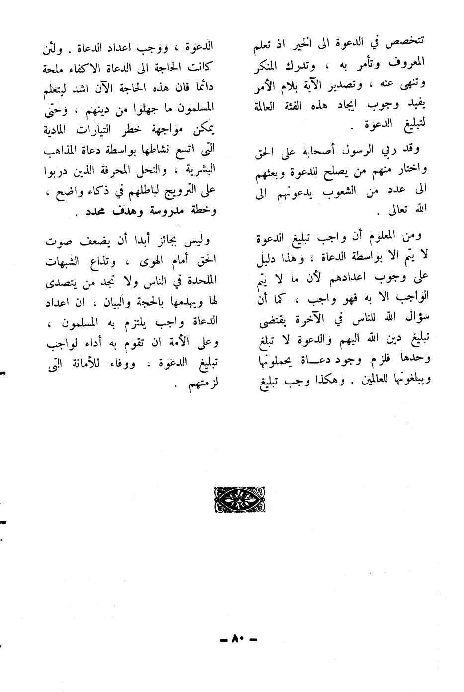 وليس بجائز أبدا أن يضعف صوت الحق أمام الهوى، وتذاع الشبهات الملحدة في الناس ولا تجد من يتصدى لها ويهدمها بالحجة والبيان، إن إعداد الدعاة واجب يلتزم به المسلمون، وعلى الأمة أن تقوم به أداء لواجب الدعوة، ووفاء للأمانة التي لزمتهم.