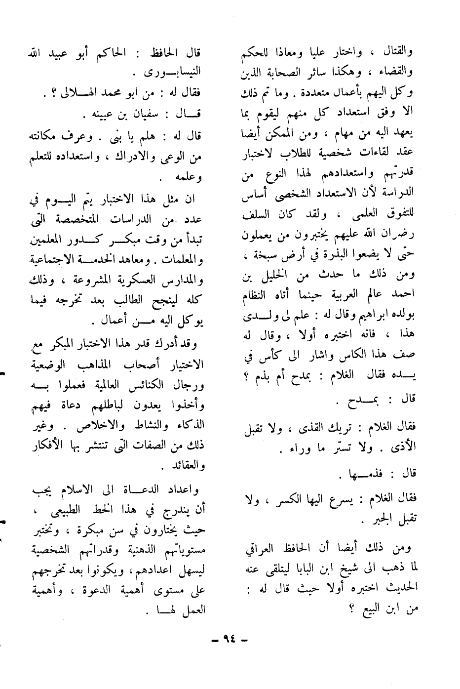 والقتال، واختار علياً ومعاذاً للحكم والقضاء، وهكذا سائر الصحابة الذين وكل إليهم بأعمال متعددة. وما تم ذلك إلا وفق استعداد كل منهم ليقوم بما يعهد إليه من مهام، ومن الممكن أيضاً عقد لقاءات شخصية للطلاب لاختبار قدرتهم واستعدادهم لهذا النوع من الدراسة لأن الاستعداد الشخصي أساس للتفوق العلمي، ولقد كان السلف رضوان الله عليهم يختبرون من يعلمون حتى لا يضعوا البذرة في أرض سبخة، ومن ذلك ما حدث من الخليل بن أحمد عالم العربية حينما أتاه النظام بولده إبراهيم وقال له: علم لي ولدي هذا، فإنه اختبره أولاً، وقال له صف هذا الكأس وأشار إلى كأس في يده فقال الغلام: بمدح أم بذم؟