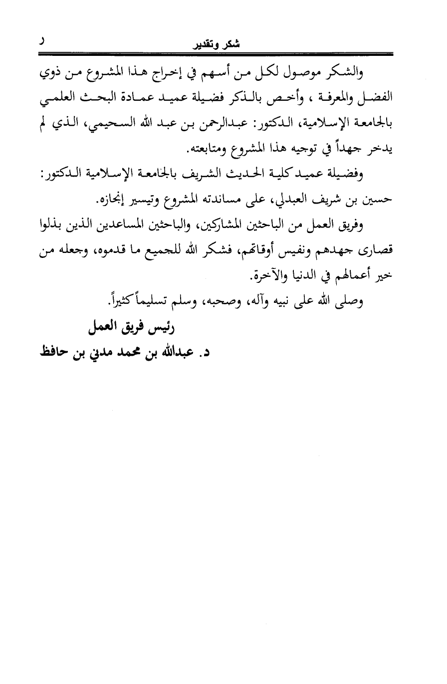 والشكر موصول لكل من أسهم في إخراج هذا المشروع من ذوي الفضل والمعرفة، وأخص بالذكر فضيلة عميد عمادة البحث العلمي بالجامعة الإسلامية، الدكتور: عبد الرحمن بن عبد الله السحيمي، الذي لم يدخر جهدًا في توجيه هذا المشروع ومتابعته.