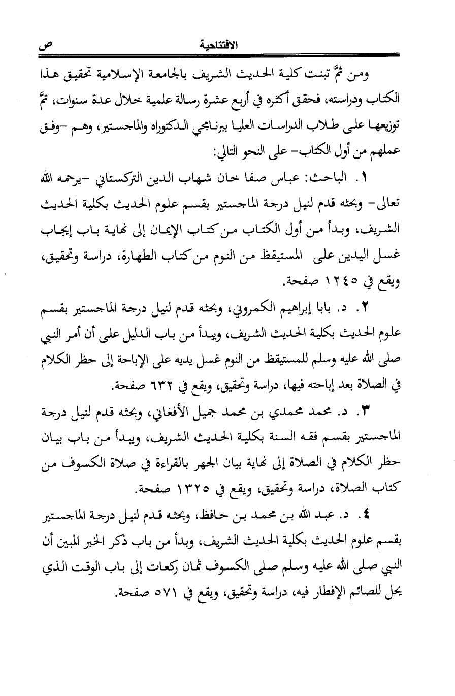 1 - الباحث: عباس صفا خان شهاب الدين التركستاني - يرحمه الله تعالى - وبحثه قدم لنيل درجة الماجستير بقسم علوم الحديث بكلية الحديث الشريف، وبدأ من أول الكتاب من كتاب الإيمان إلى نهاية باب إيجاب غسل اليدين على المستيقظ من النوم من كتاب الطهارة، دراسة وتحقيق، ويقع في 1245 صفحة.