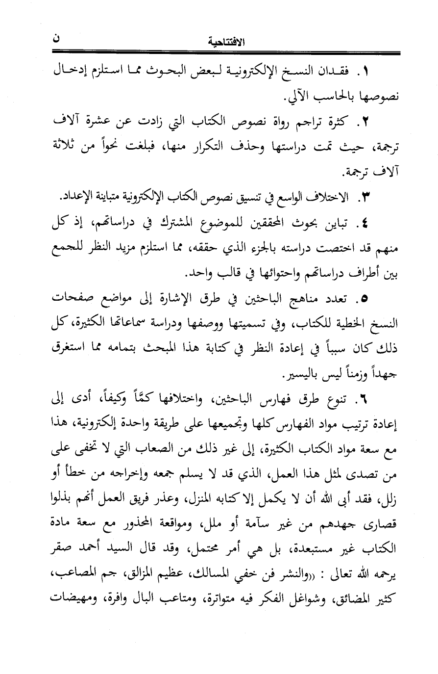 6. تنوع طرق فهارس الباحثين، واختلافها كمًّا وكيفًا، أدى إلى إعادة ترتيب مواد الفهارس كلها وتجميعها على طريقة واحدة إلكترونية، هذا مع سعة مواد الكتاب الكثيرة، إلى غير ذلك من الصعاب التي لا تخفى على من تصدى لمثل هذا العمل، الذي قد لا يسلم جمعه وإخراجه من خطأ أو زلل، فقد أبى الله أن لا يكمل إلا كتابه المنزل، وعذر فريق العمل أنهم بذلوا قصارى جهدهم من غير سآمة أو ملل، ومواقعة المحذور مع سعة مادة الكتاب غير مستبعدة، بل هي أمر محتمل، وقد قال السيد أحمد صقر يرحمه الله تعالى: "والنشر فن خفي المسالك، عظيم المزالق، جم المصاعب، كثير المضائق، وشواغل الفكر فيه متواترة، ومتاعب البال وافرة، ومهيضات