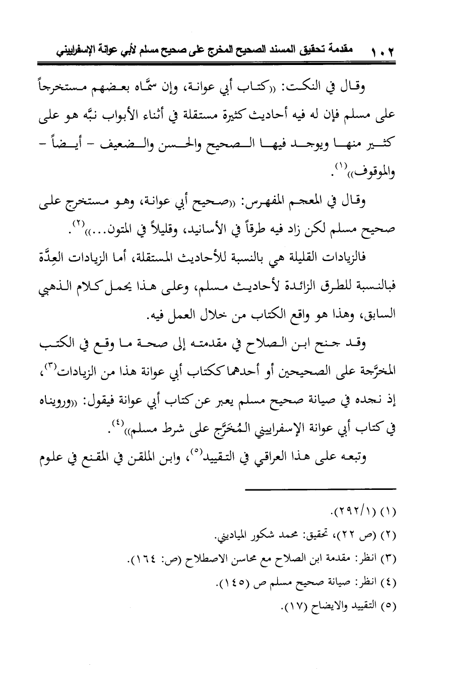 وقد جنح ابن الصلاح في مقدمته إلى صحة ما وقع في الكتب المخرَّجة على الصحيحين أو أحدهما ككتاب أبي عوانة هذا من الزيادات (¬3)، إذ نجده في صيانة صحيح مسلم يعبر عن كتاب أبي عوانة فيقول: "ورويناه في كتاب أبي عوانة الإسفراييني المُخَرَّج على شرط مسلم" (¬4).