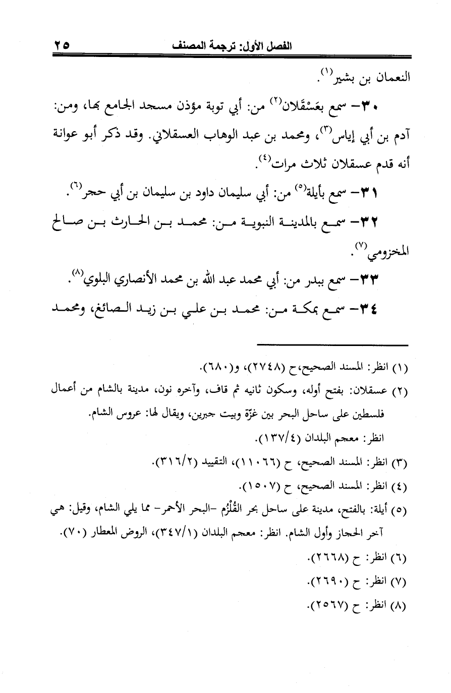 30 - سمع بعَسْقَلان (¬2) من: أبي توبة مؤذن مسجد الجامع بها، ومن: آدم بن أبي إياس (¬3)، ومحمد بن عبد الوهاب العسقلاني. وقد ذكر أبو عوانة أنه قدم عسقلان ثلاث مرات (¬4).