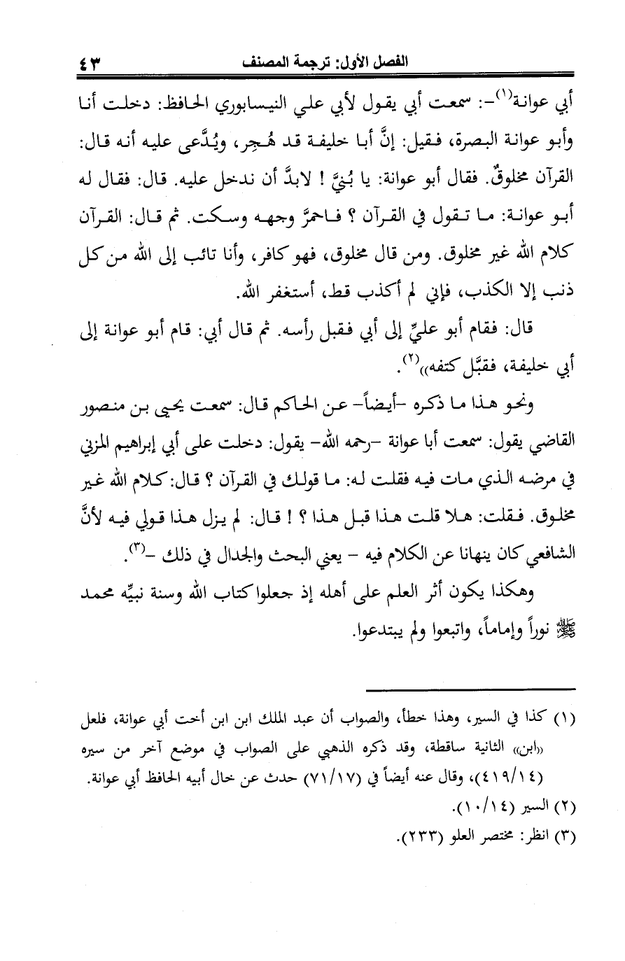 ونحو هذا ما ذكره -أيضًا- عن الحكم قال: سمعت يحيى بن منصور القاضي يقول: سمعت أبا عوانة -رحمه الله- يقول: دخلت على أبي إبراهيم المزني في مرضه الذي مات فيه فقلت له: ما قولك في القرآن؟ قال: كلام الله غير مخلوق. فقلت: هلا قلت هذا قبل هذا؟! قال: لم يزل هذا قولي فيه لأنَّ الشافعي كان ينهانا عن الكلام فيه -يعني البحث والجدال في ذلك- (¬3).