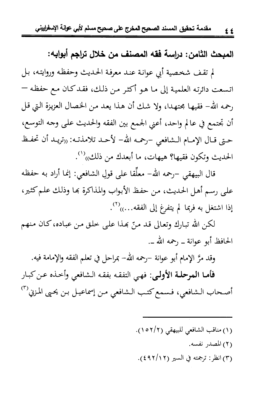 وقد مرَّ الإمام أبو عوانة -رحمه الله- بمراحل في تعلم الفقه والإمامة فيه.