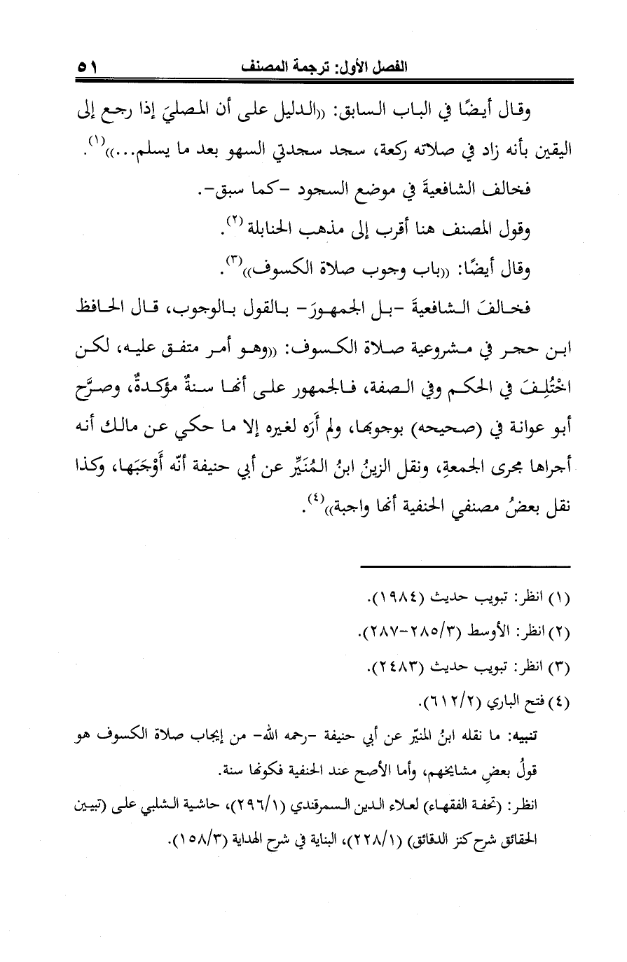 تنبيه: ما نقله ابنُ المنيّر عن أبي حنيفة -رحمه الله- من إيجاب صلاة الكسوف هو قولُ بعضِ مشايخهم، وأما الأصح عند الحنفية فكونها سنة.