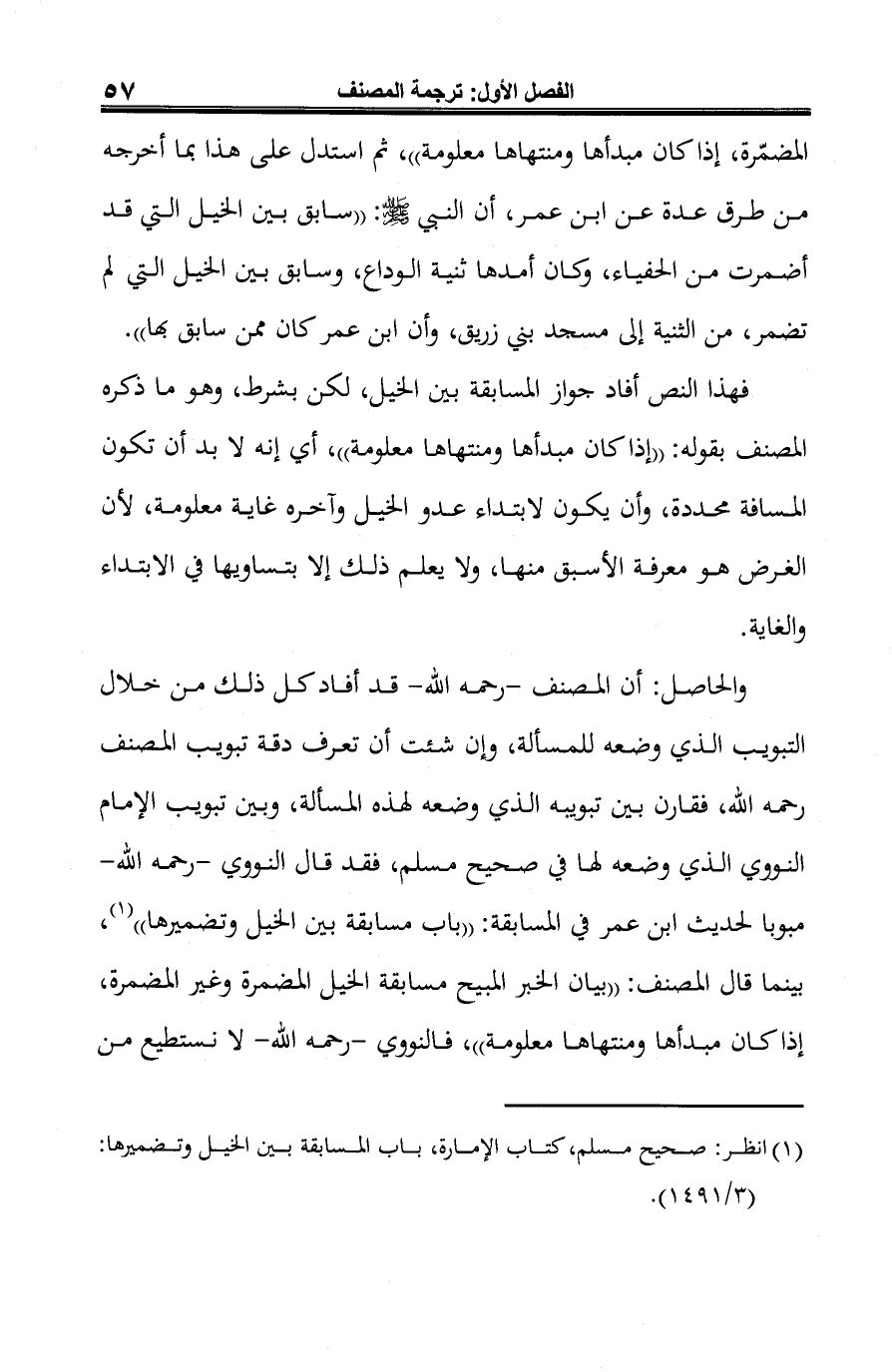 والحاصل: أن المصنف -رحمه الله- قد أفاد كل ذلك من خلال التبويب الذي وضعه للمسألة، وإن شئت أن تعرف دقة تبويب المصنف رحمه الله، فقارن بين تبويبه الذي وضعه لهذه المسألة، وبين تبويب الإمام النووي الذي وضعه لها في صحيح مسلم، فقد قال النووي -رحمه الله- مبوبا لحديث ابن عمر في المسابقة: "باب مسابقة بين الخيل وتضميرها" (¬1)، بينما قال المصنف: "بيان الخبر المبيح مسابقة الخيل المضمرة وغير المضمرة، إذا كان مبدأها ومنتهاها معلومة"، فالنووي -رحمه الله- لا نستطيع من