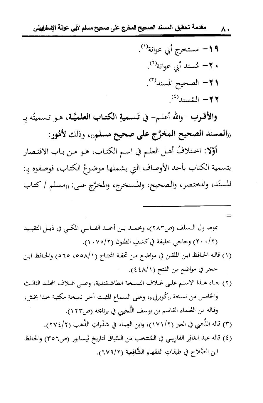 والأقرب -والله أعلم- في تَسميةِ الكتاب العلميَّة، هو تسميتُه بِـ "المسند الصحيح المخرَّج على صحيح مسلم"، وذلك لأمُور: