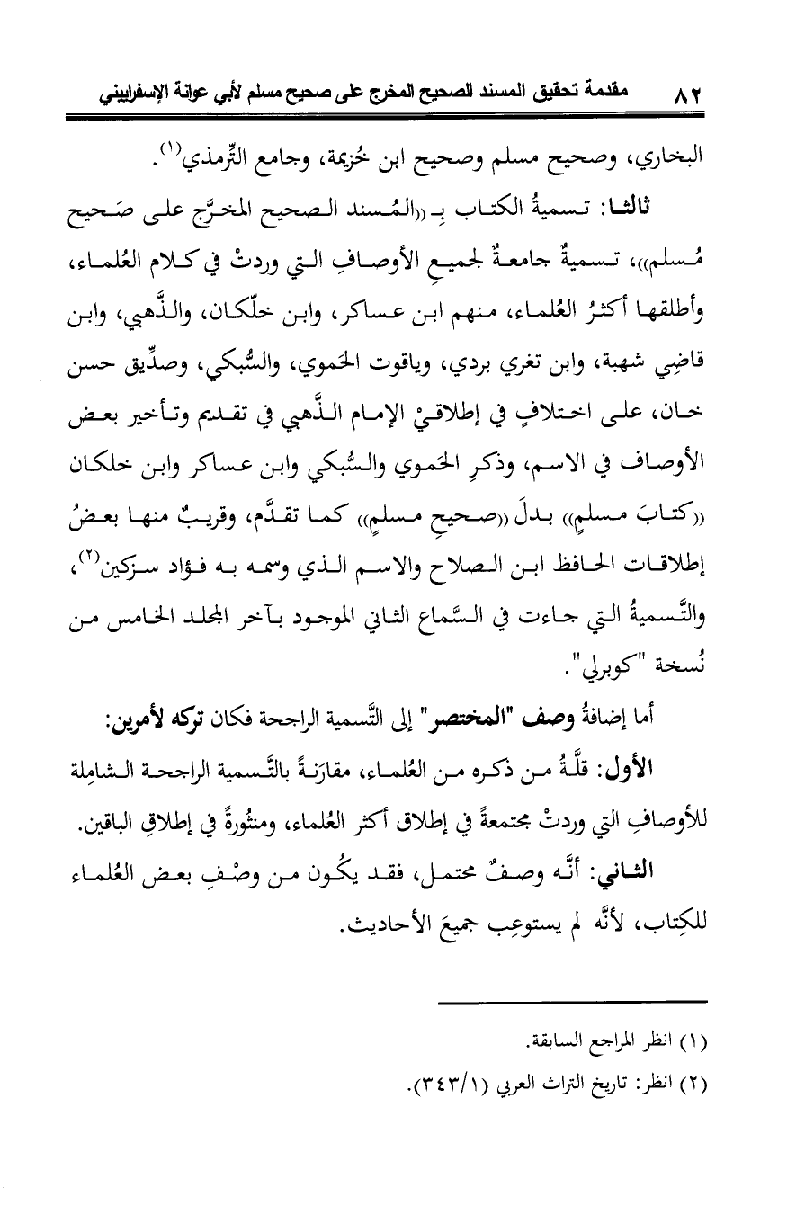 ثالثا: تسميةُ الكتاب بِـ "المُسند الصحيح المخرَّج على صَحيح مُسلم"، تسميةٌ جامعةٌ لجميعِ الأوصافِ التي وردتْ في كلام العُلماء، وأطلقها أكثرُ العُلماء، منهم ابن عساكر، وابن خلّكان، والذَّهبي، وابن قاضِي شهبة، وابن تغري بردي، وياقوت الحَموي، والسُّبكي، وصدِّيق حسن خان، على اختلافٍ في إطلاقيْ الإمام الذَّهبي في تقديم وتأخير بعض الأوصاف في الاسم، وذكرِ الحَموي والسُّبكي وابن عساكر وابن خلكان "كتابَ مسلمٍ" بدلَ "صحيحِ مسلمٍ" كما تقدَّم، وقريبٌ منها بعضُ إطلاقات الحافظ ابن الصلاح والاسم الذي وسمه به فؤاد سزكين (¬2)، والتَّسميةُ التي جاءت في السَّماع الثاني الموجود بآخر المجلد الخامس من نُسخة "كوبرلي".