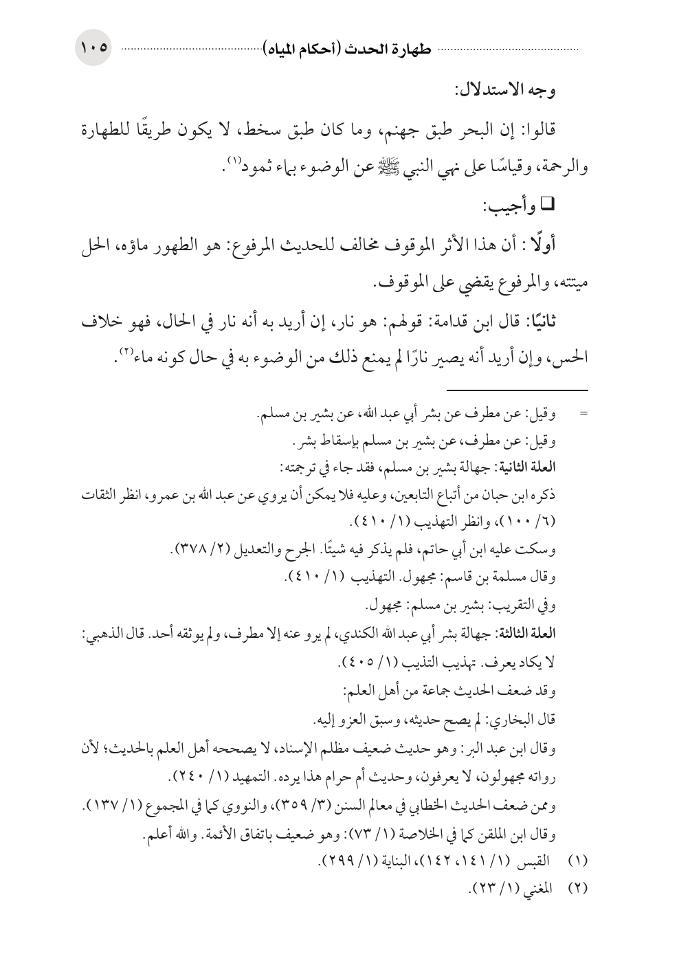 ثانيًا: قال ابن قدامة: قولهم: هو نار، إن أريد به أنه نار في الحال، فهو خلاف الحس، وإن أريد أنه يصير نارًا لم يمنع ذلك من الوضوء به في حال كونه ماء (¬٢).