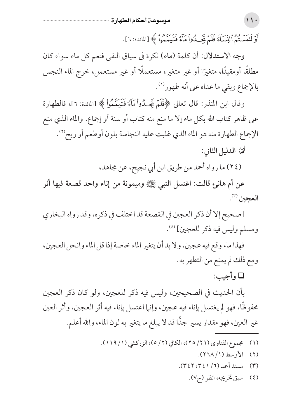 وجه الاستدلال: أن كلمة (ماء) نكرة فى سياق النفى فتعم كل ماء سواء كان مطلقًا أومقيدًا، متغيرًا أو غير متغير، مستعملًا أو غير مستعمل، خرج الماء النجس بالإجماع وبقي ما عداه على أنه طهور (¬١).