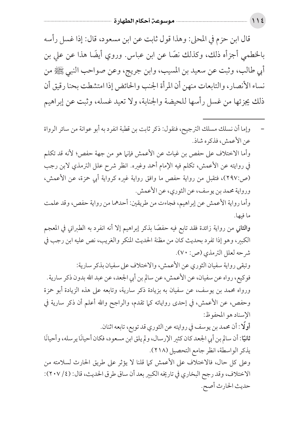 أبي طالب، وثبت عن سعيد بن المسيب، وابن جريج، وعن صواحب النبي صلى الله عليه وسلم من نساء الأنصار، والتابعات منهن أن المرأة الجنب والحائض إذا امتشطت بحنا رقيق أن ذلك يجزئها من غسل رأسها للحيضة والجنابة، ولا تعيد غسله، وثبت عن إبراهيم